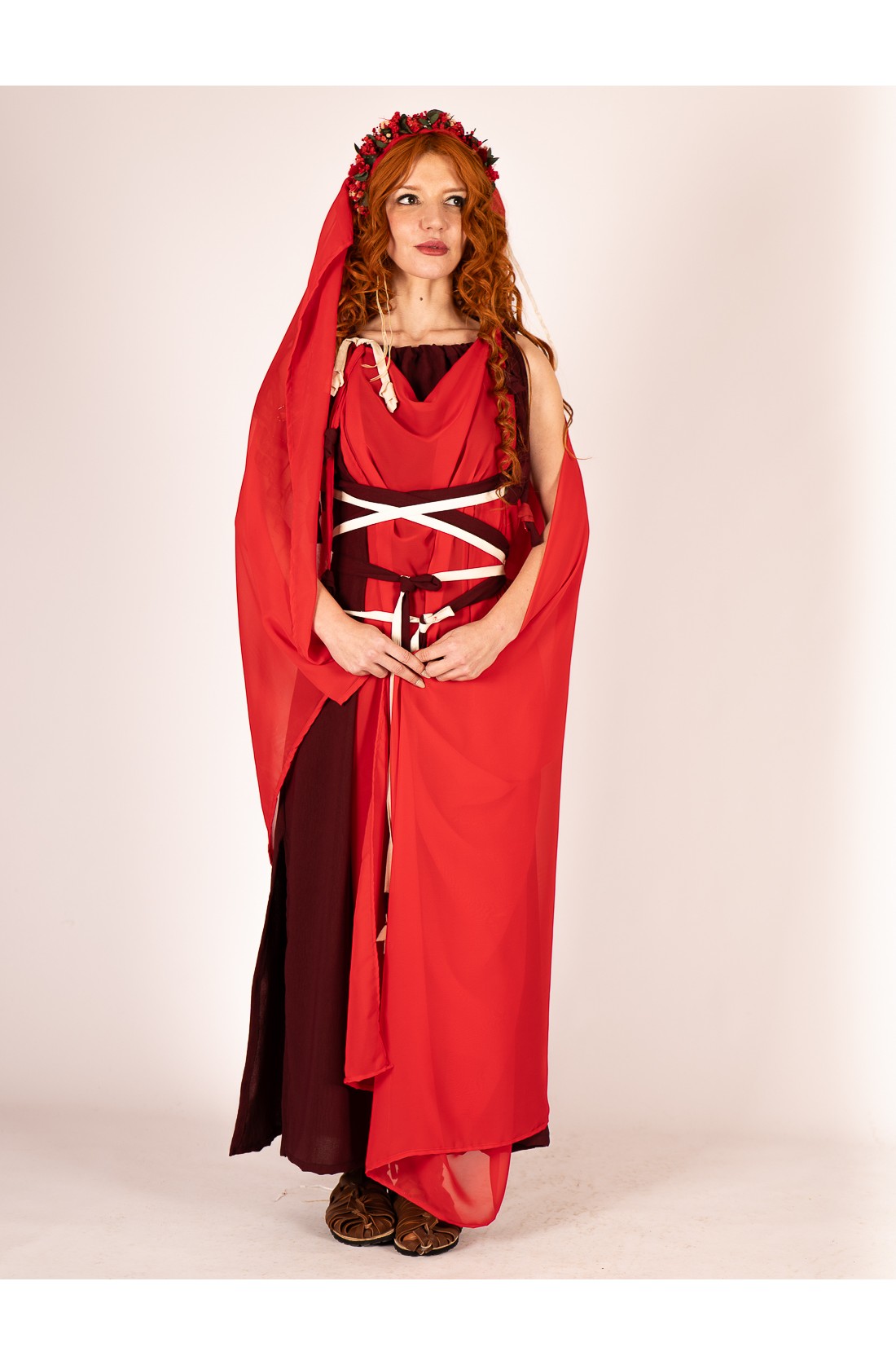 Vestido romano rojo burdeos con manto envolvente