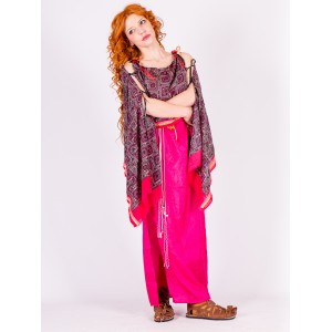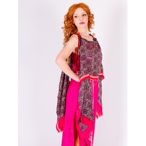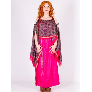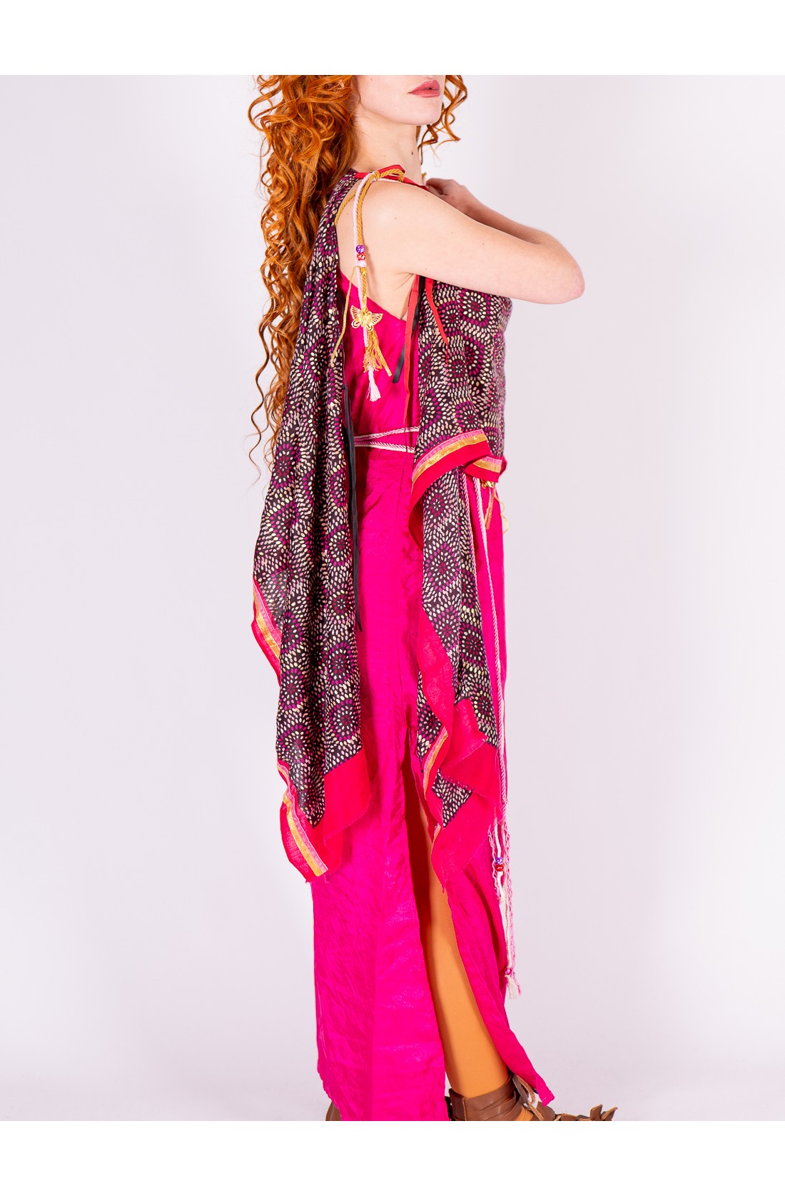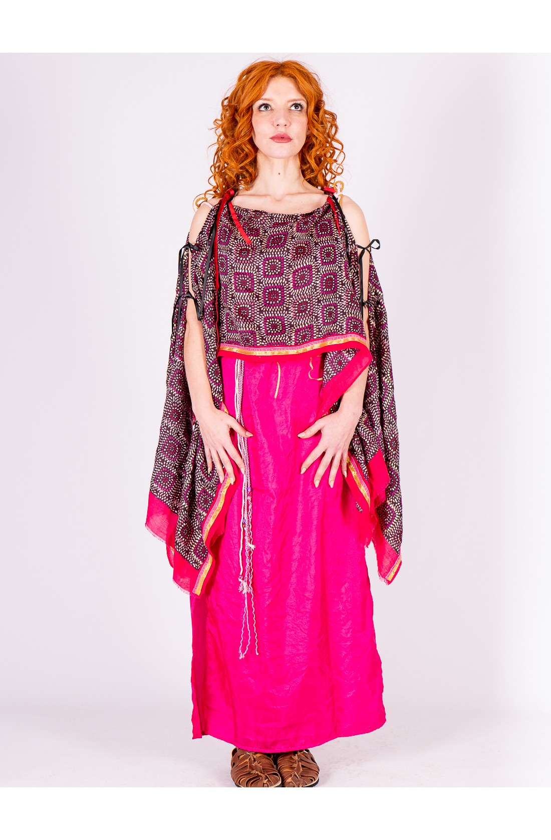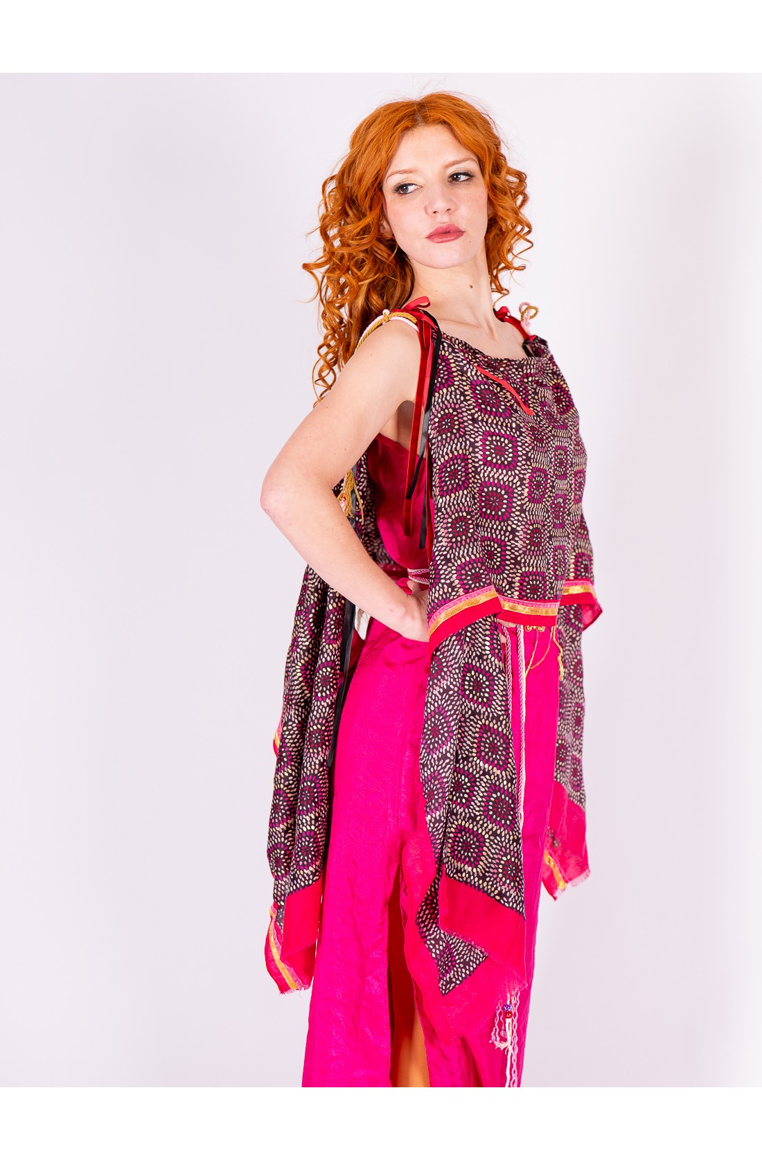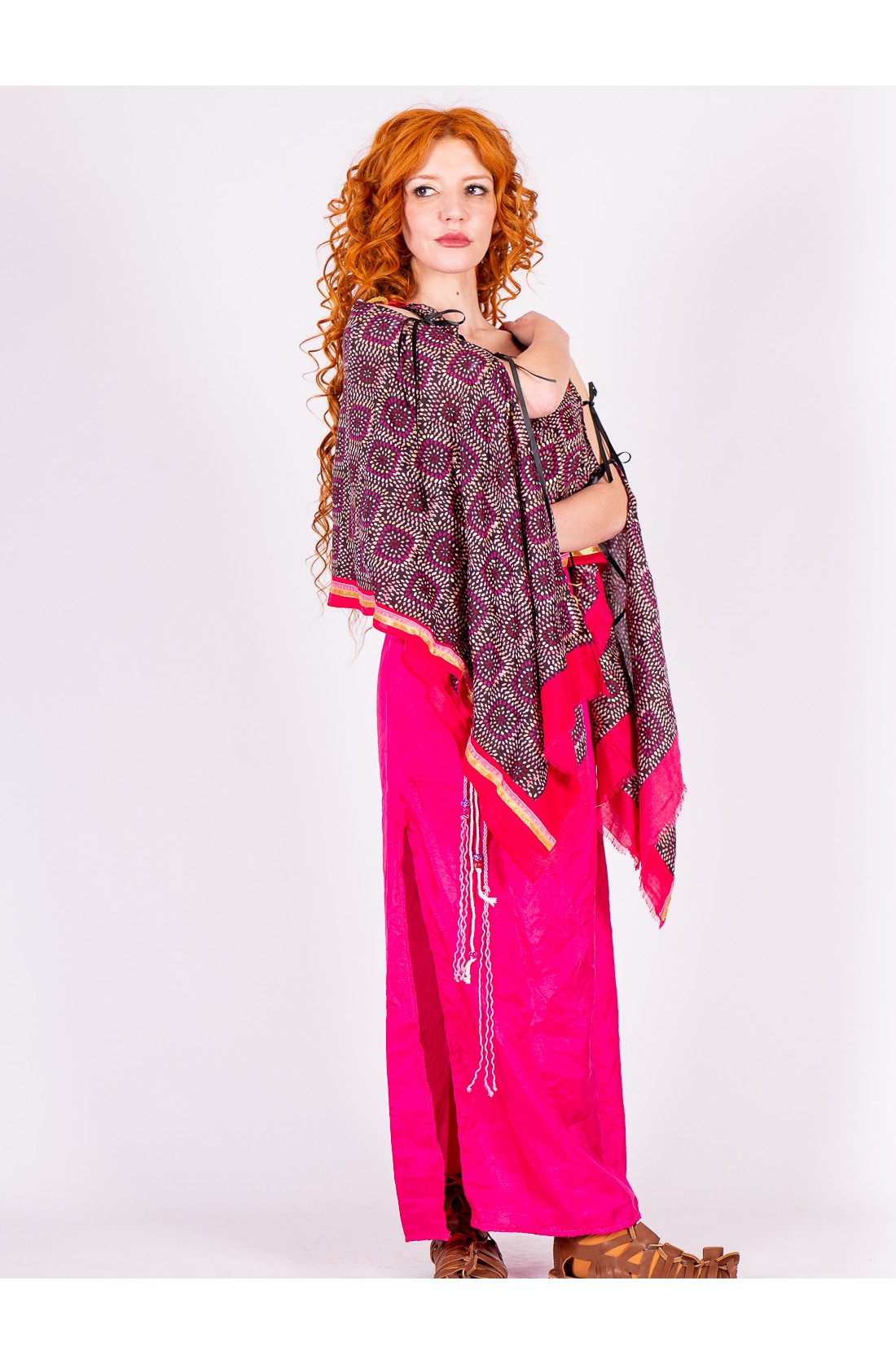 Se acompaña de un amplio manto estampado en motivos geométricos en tonos negros y magenta, rematado con borde en contraste y detalles dorados que aportan un sutil brillo escénico. Ligero y envolvente, puede dejarse caer sobre los brazos, recogerse al frente o drapearse para crear volumen y dramatismo.