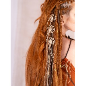 Incorpora abalorios de madera y piezas acrílicas, combinados con pequeños detalles decorativos que recuerdan motivos florales. Las hebras caen de forma irregular, creando un efecto orgánico que se mueve con el cabello y acompaña cada giro de cabeza.