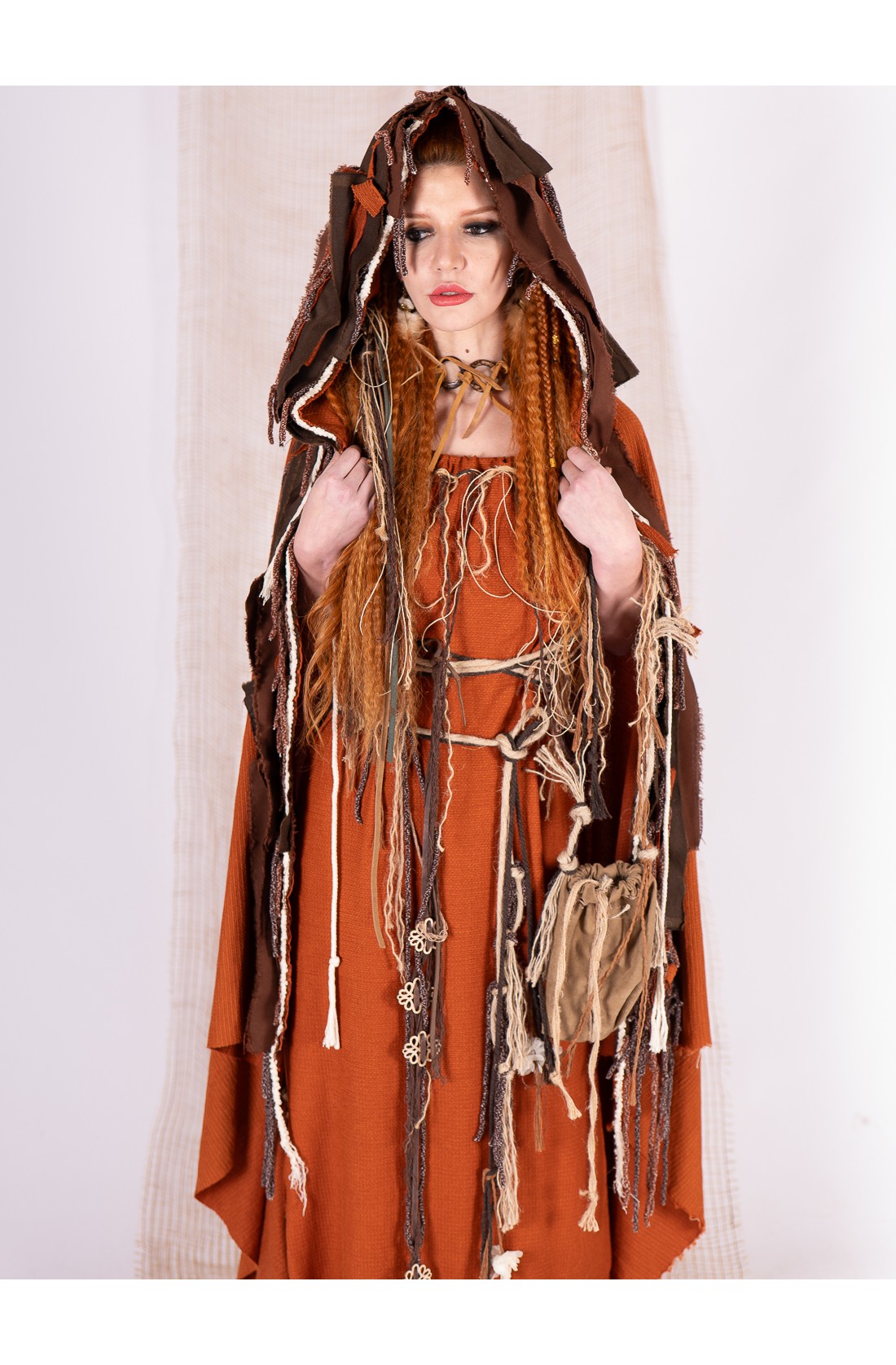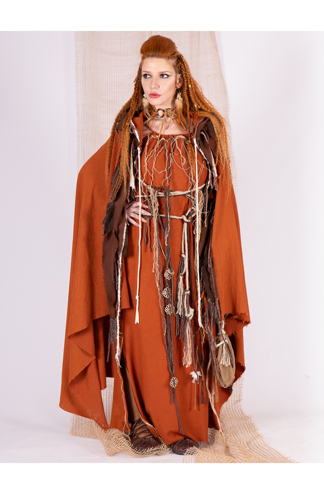 Capa en tono teja confeccionada en tejido con caída amplia y movimiento envolvente. El color recuerda a la arcilla cocida y a los tintes tierra, cálido y profundo, muy ligado a estética celta y vikinga.