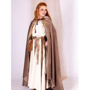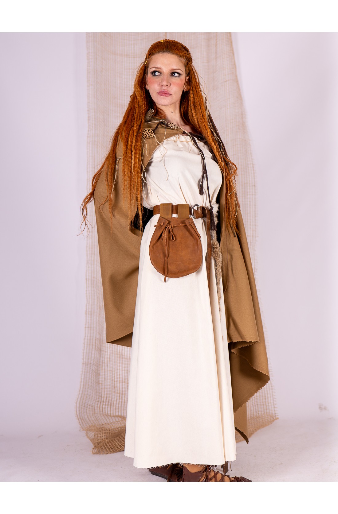 Vestido en tono crema de mezcla de algodón, de línea amplia y hombro descubierto. El escote fruncido, adornado con cuerda de yute, introduce suavidad, mientras el cinturón aporta contraste: tiras de cuero envejecido, piel de conejo y abalorios de madera que descienden sin orden rígido, como si cada elemento hubiera sido recogido en el viaje.