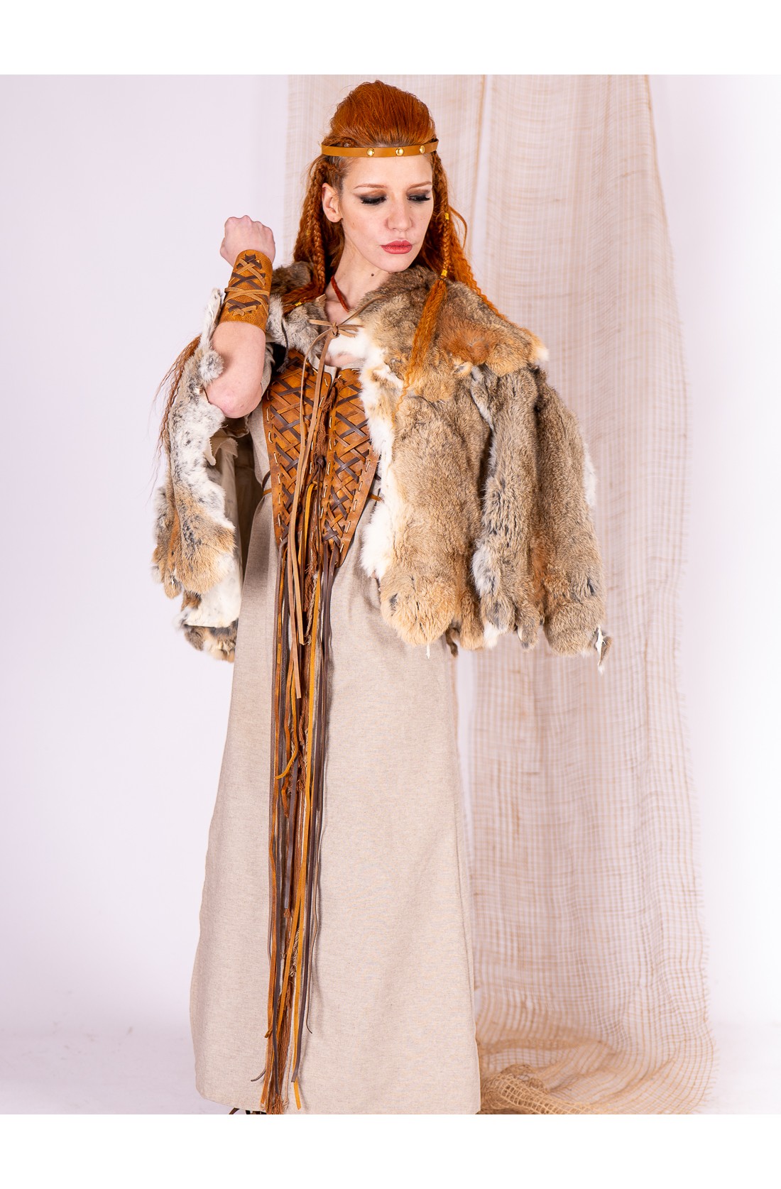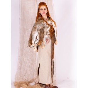 Capa de abrigo confeccionada en conejo natural, pensada para mujeres celtas y vikingas que buscan una prenda cálida con presencia. El pelo natural crea una superficie rica en matices, con tonos tierra y claros.