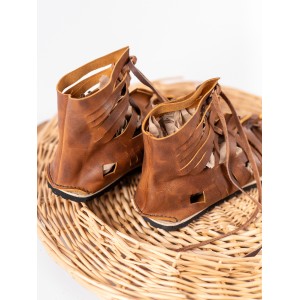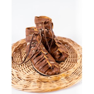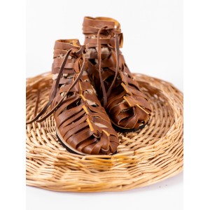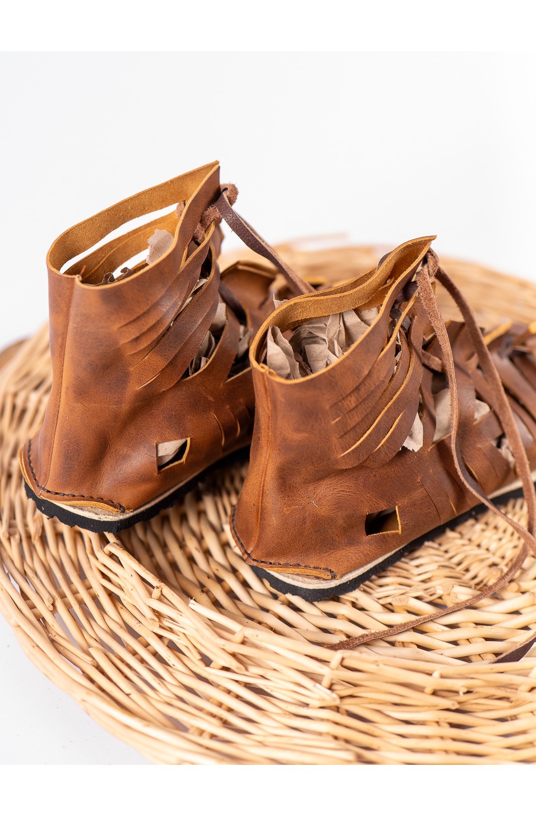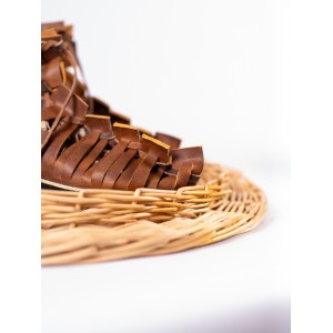 Calzado romano de tiras confeccionado en cuero envejecido en tono marrón, con variaciones de color, pequeñas marcas, pliegues y señales propias de este tipo de curtido que forman parte de su carácter y de su manera natural de envejecer.