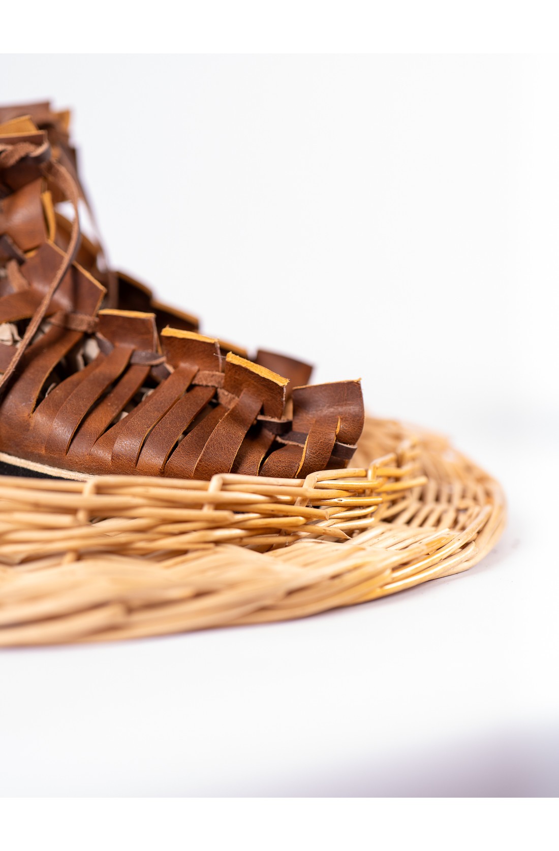 Su estructura abierta recoge el pie mediante tiras anchas y cordones de ajuste que suben hacia el tobillo, ofreciendo una sujeción firme y cómoda. Con el uso, el cuero va cediendo y adaptándose al paso, dando lugar a una pisada más cercana a la sensación del calzado histórico.