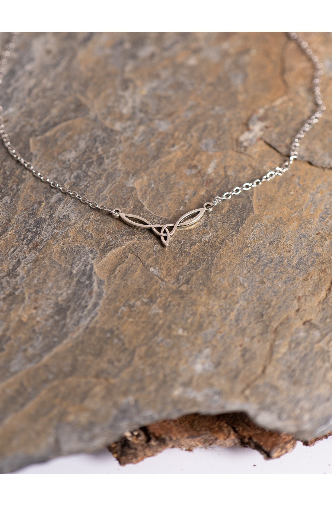 Gargantilla celta con nudo entrelazado en acabado de color plata de 4 cm x 2 cm. La pieza central recoge la forma del nudo celta del amor eterno, un motivo ancestral que habla de unión, continuidad y un vínculo que no se rompe. Una pieza sencilla y muy elegante, que queda cerca del cuello y se puede llevar sola o combinada con otras joyas. Pensada para acompañar vestido celta, túnica vikinga, recreación histórica o LARP.
