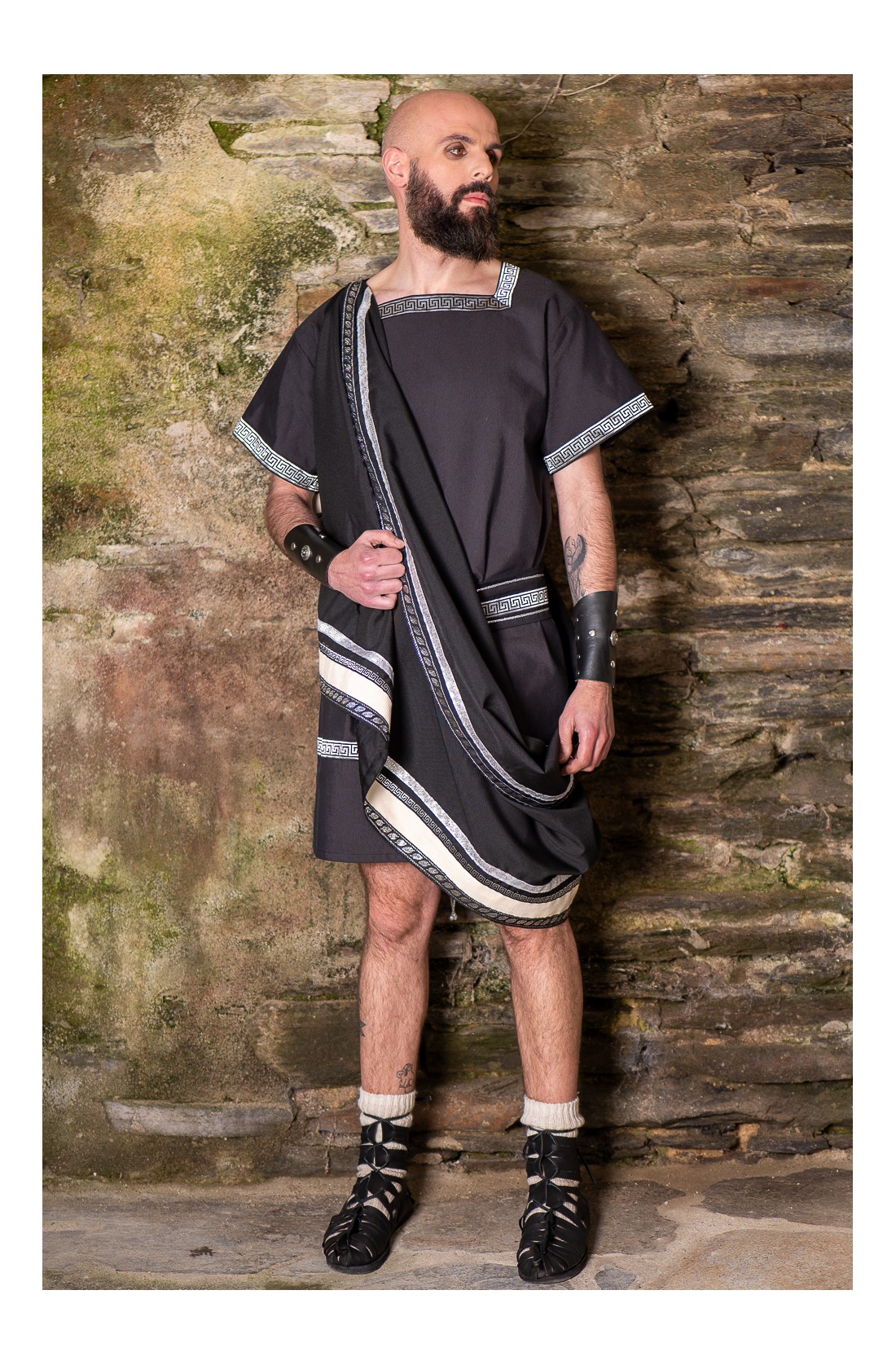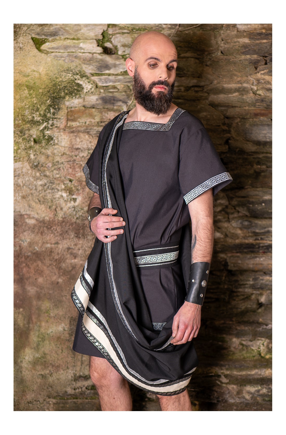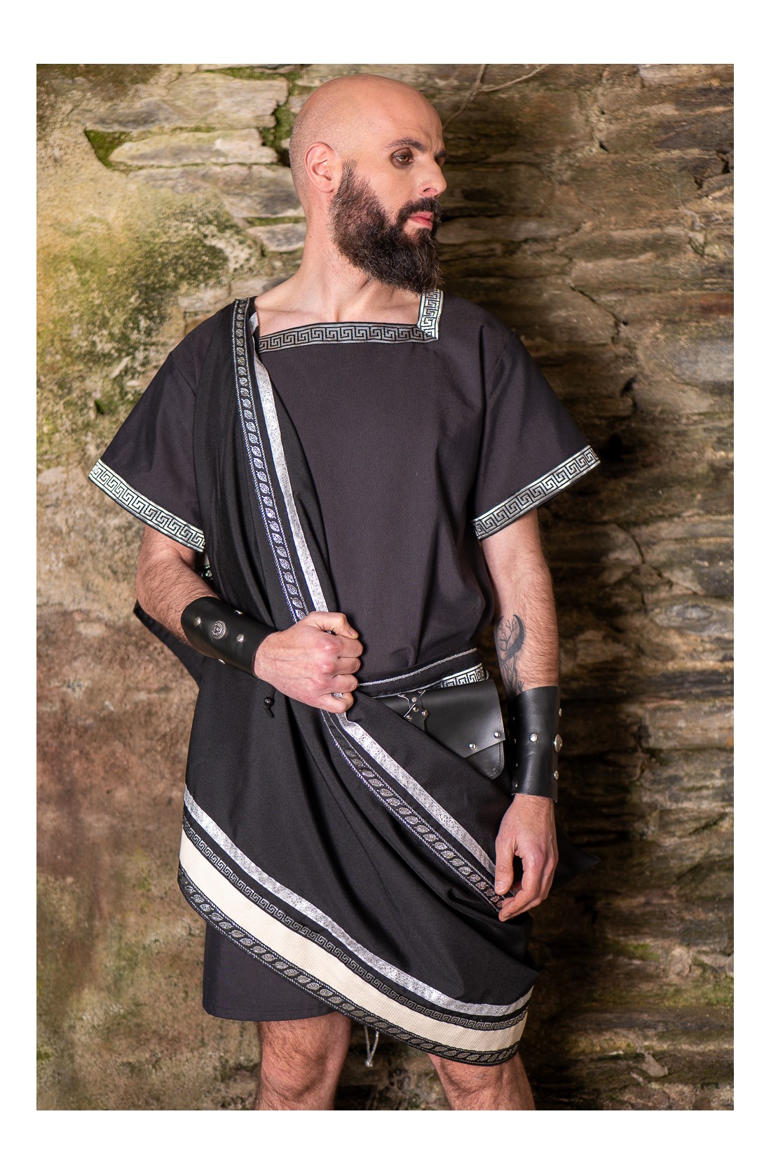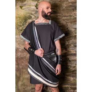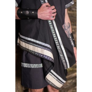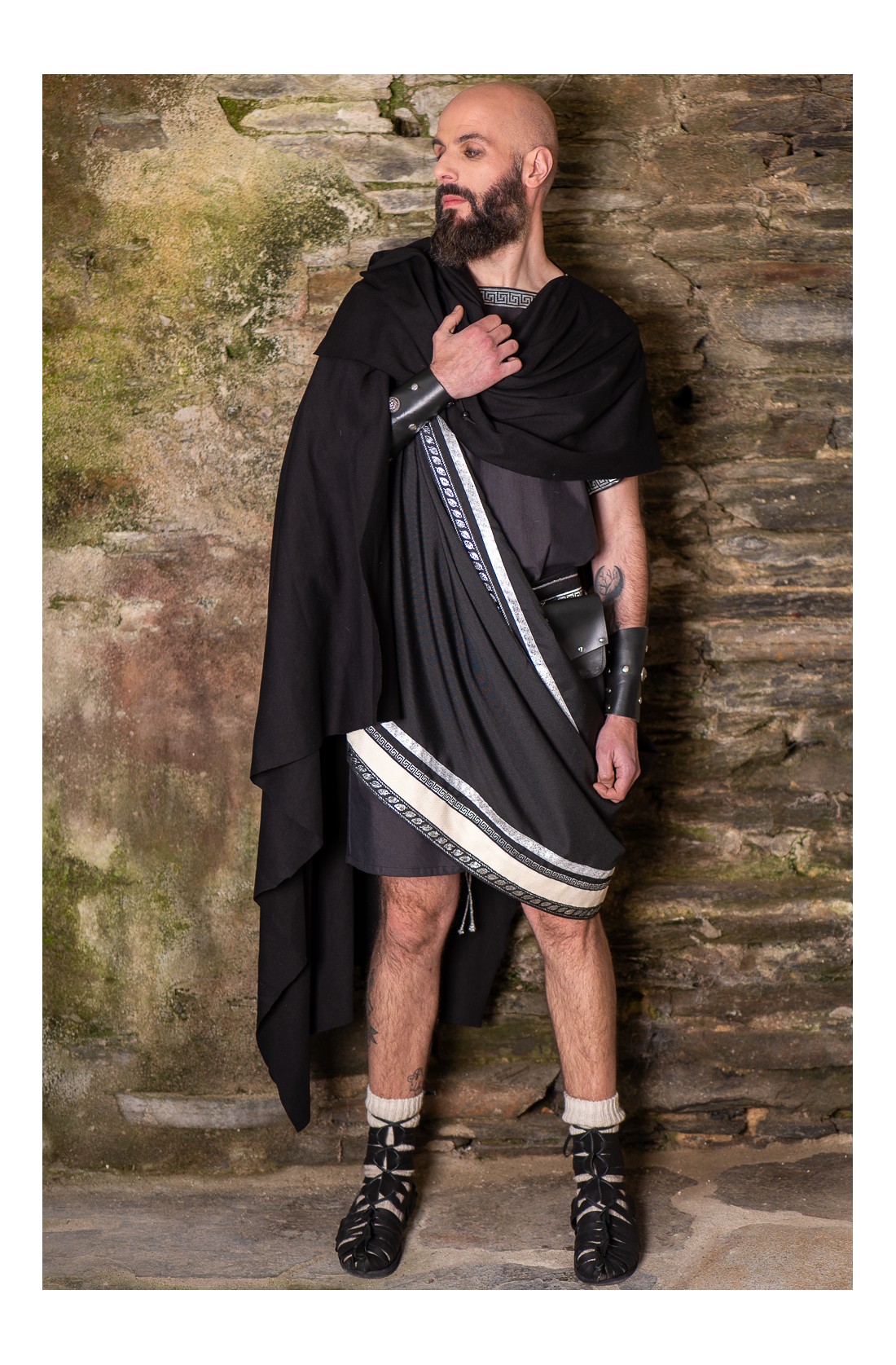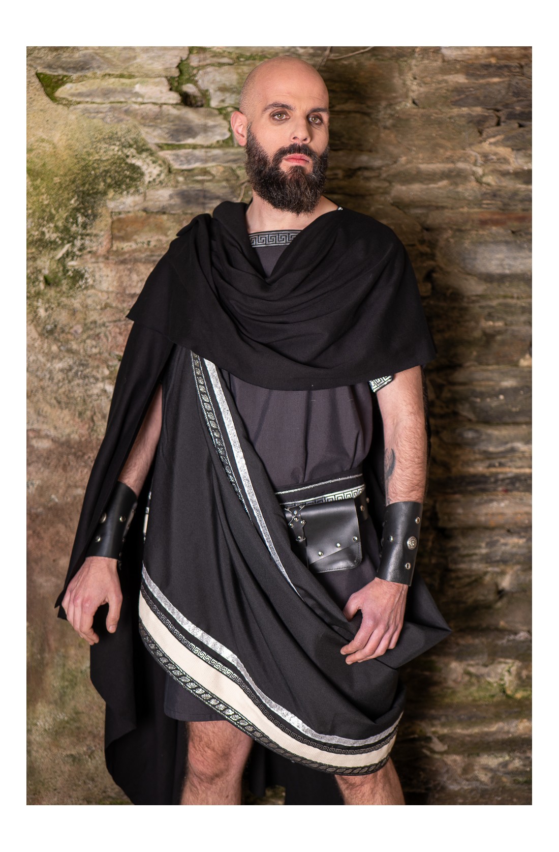 Conjunto romano de base negra, compuesto por túnica, cinto y toga cruzada, con cenefas plateadas y detalles en marfil que le dan un aire más distinguido. La túnica y el cinto siguen la línea sobria del negro con plata, mientras la toga, colocada sobre un hombro y cruzada al cuerpo, añade movimiento y un dibujo más rico gracias a sus ribetes de hojas plateadas y al contraste claro del borde. Es una pieza cómoda, con presencia y con una elegancia romana muy marcada, pensada para ferias romanas, Arde Lucus, recreación histórica o LARP. Los brazales de cuero se venden por separado.