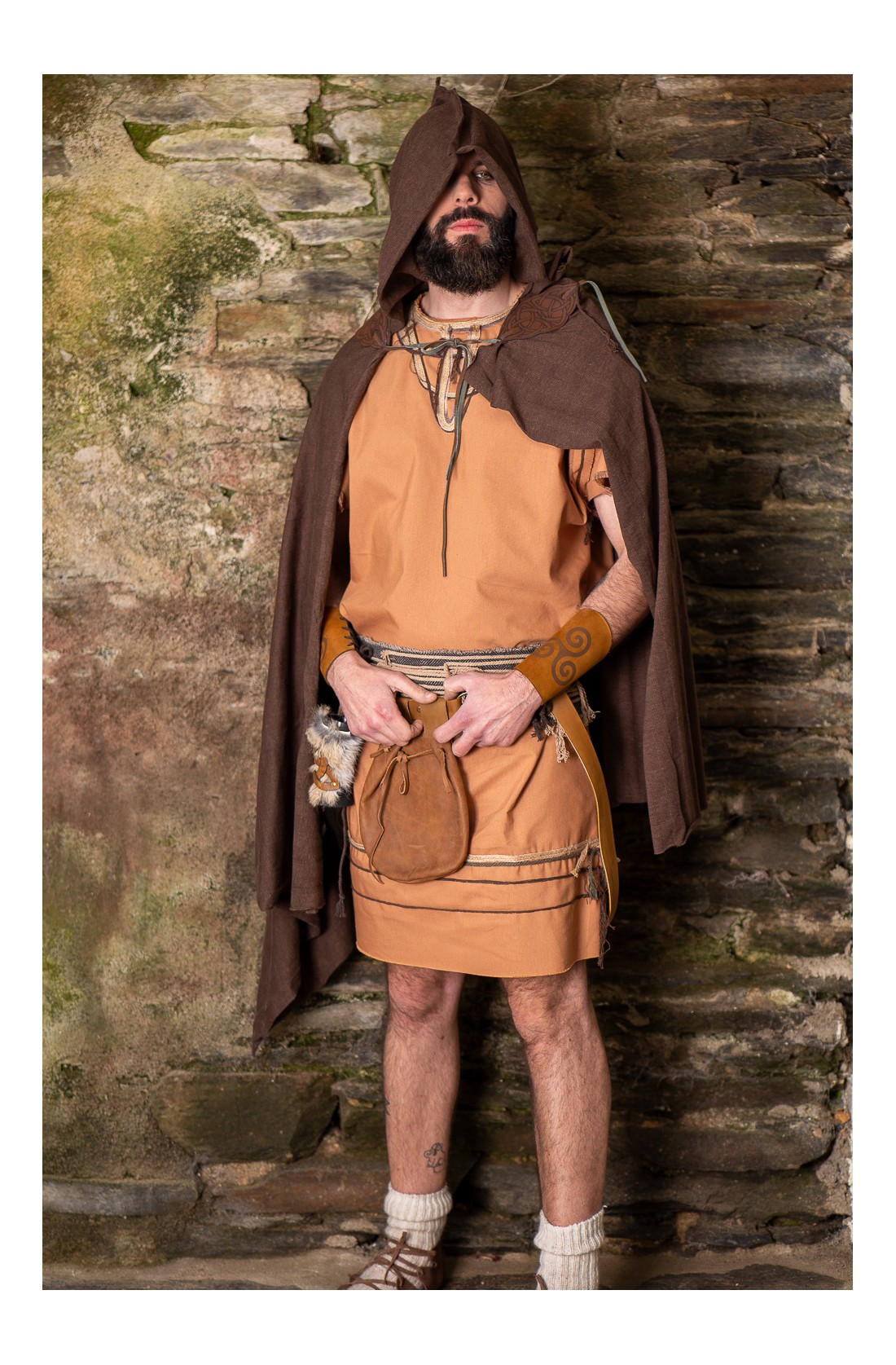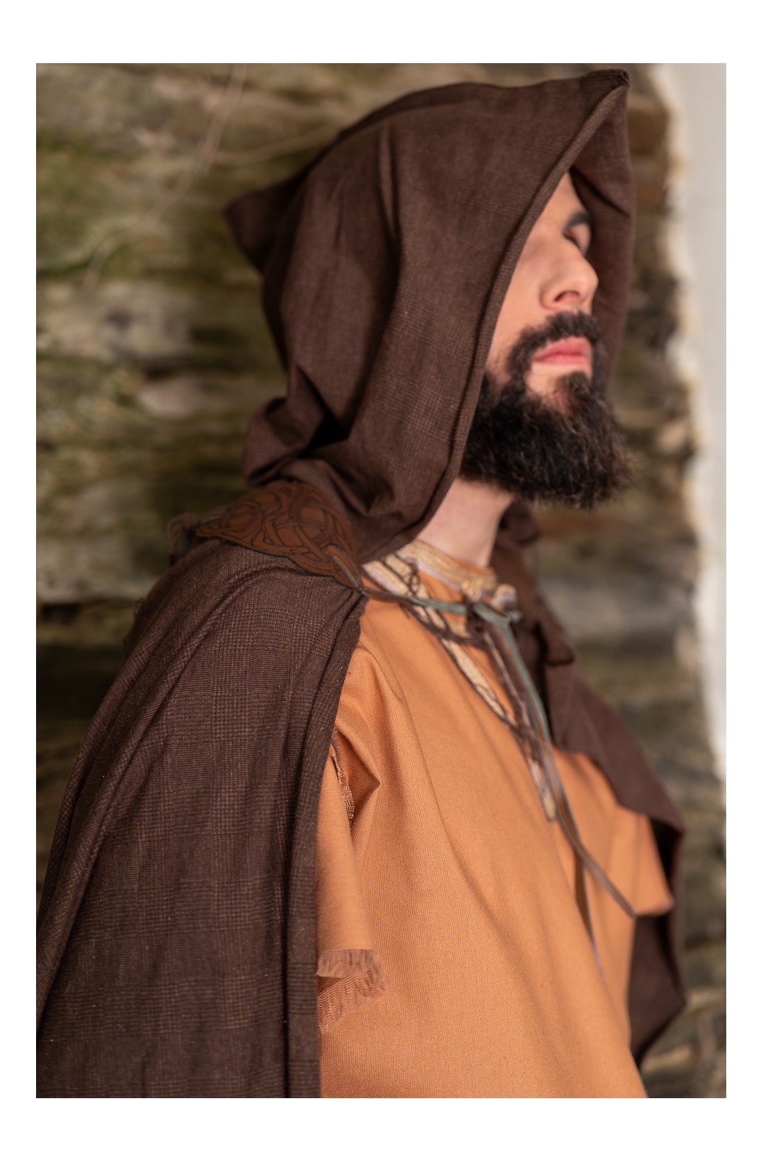 Capa en tono marrón, con capucha, diseño asimétrico de Yutecrea y cierre adornado con símbolos celtas. Se ajusta con cordón de cuero y tiene esa caída de capa de camino que complementa al personaje celta o vikingo con mucho estilo. Una capa para un Ragnar en un día tranquilo: menos batalla y más viaje. Una pieza sobria, con movimiento y buena caída, para ferias medievales, recreación histórica o LARP.