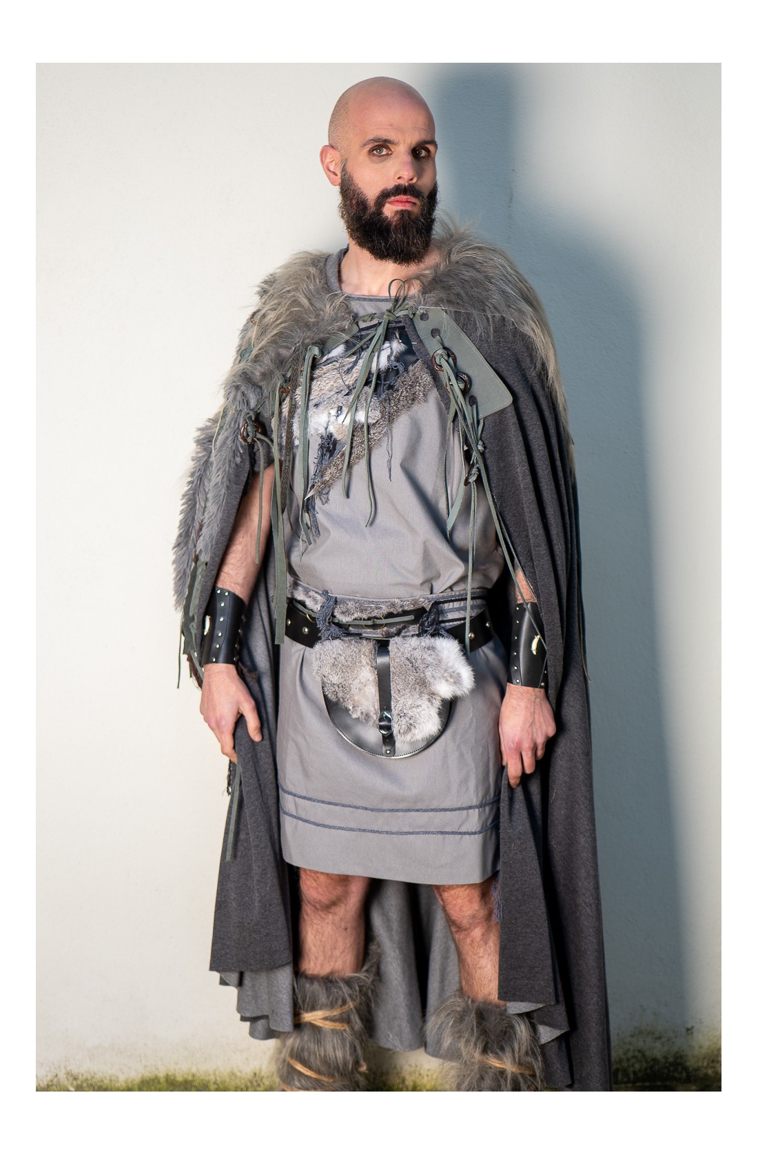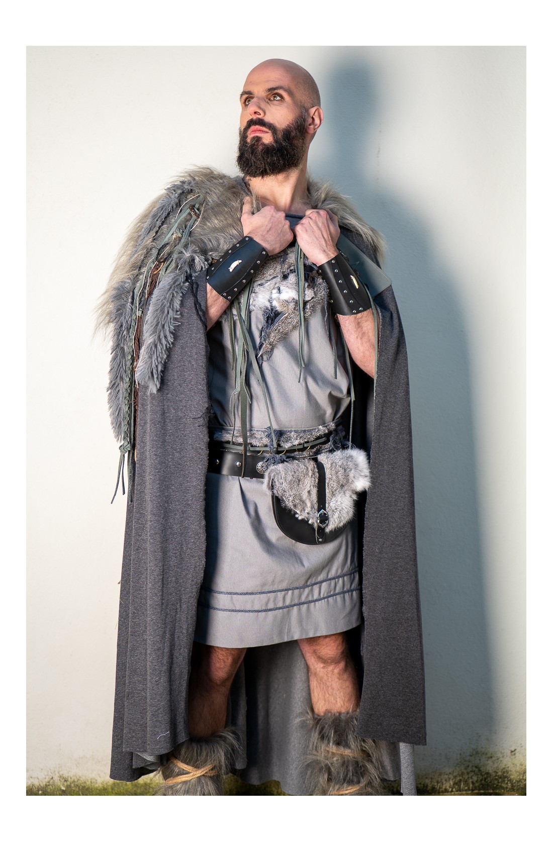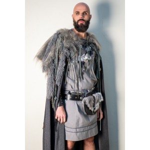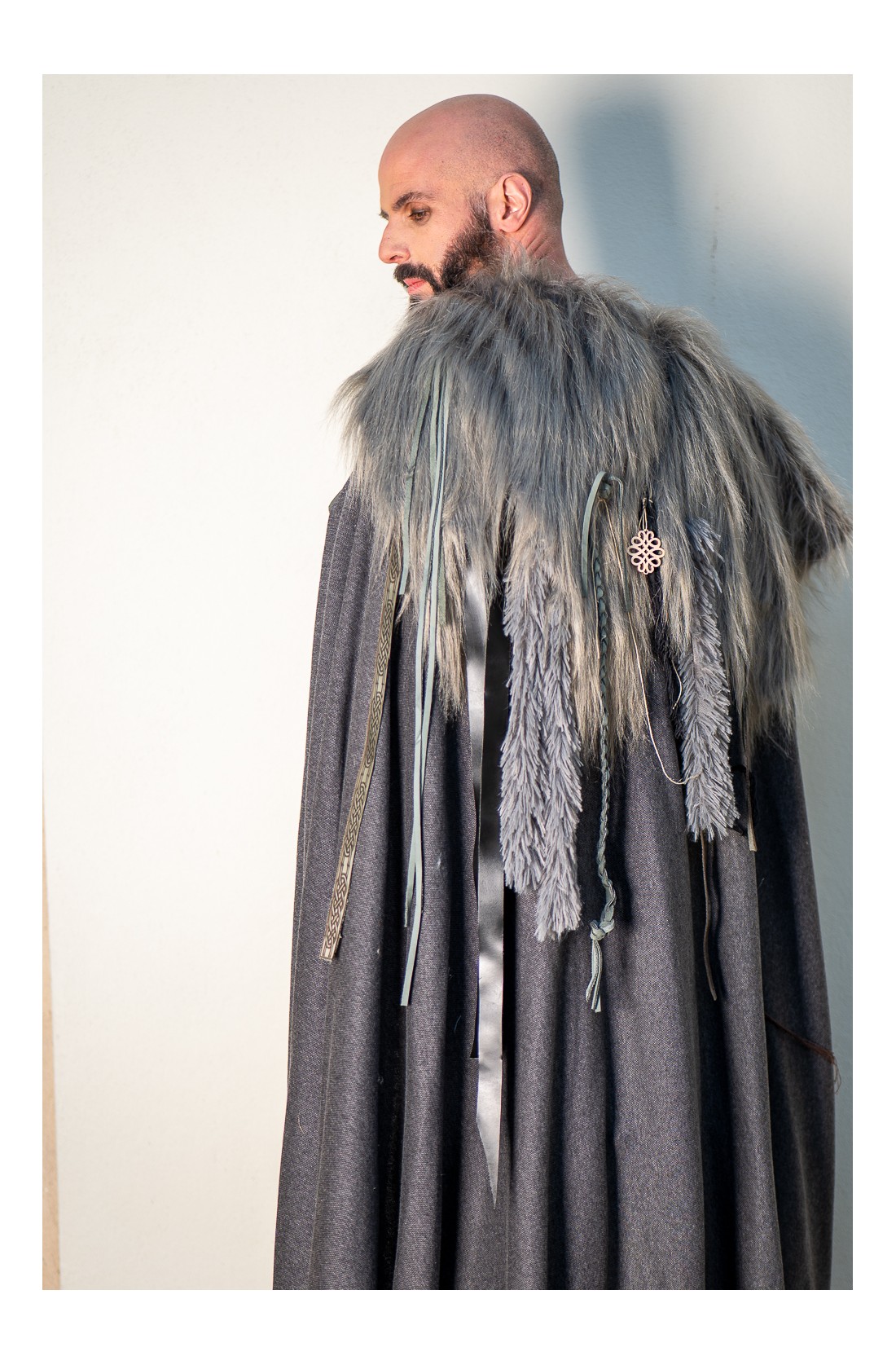 Capa en tono gris oscuro, rematada en los hombros con pelo vegano largo y una composición muy trabajada de tiras de cuero, trenzas rústicas y abalorios de madera. Lleva cierre con tiras de cuero, y cada capa se trabaja de forma artesanal en nuestros talleres, por eso puede presentar pequeñas variaciones en los detalles, algo natural en una pieza hecha a mano. Forma parte de nuestra colección de grises y se mueve dentro del mismo universo que la colección lobo de Yutecrea, para LARP, recreación histórica o noches frescas de verano.