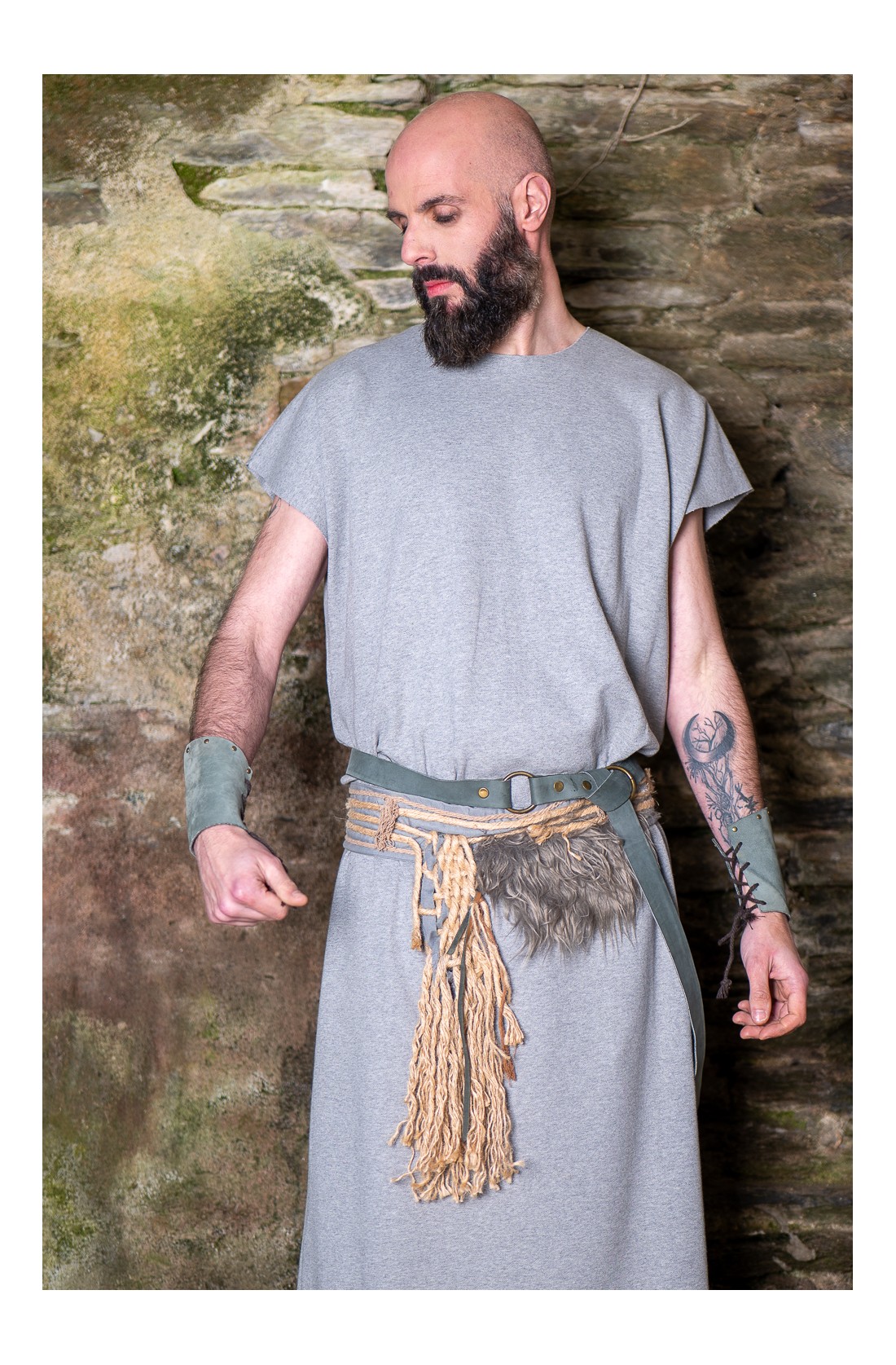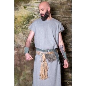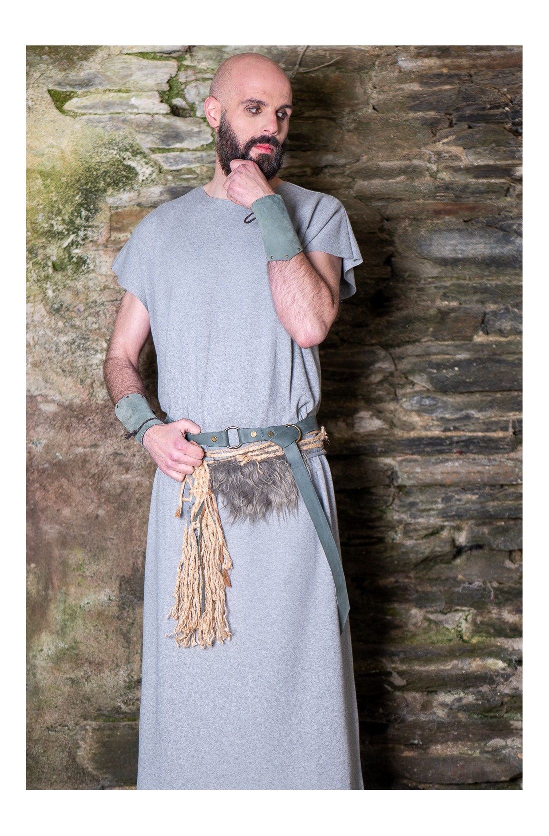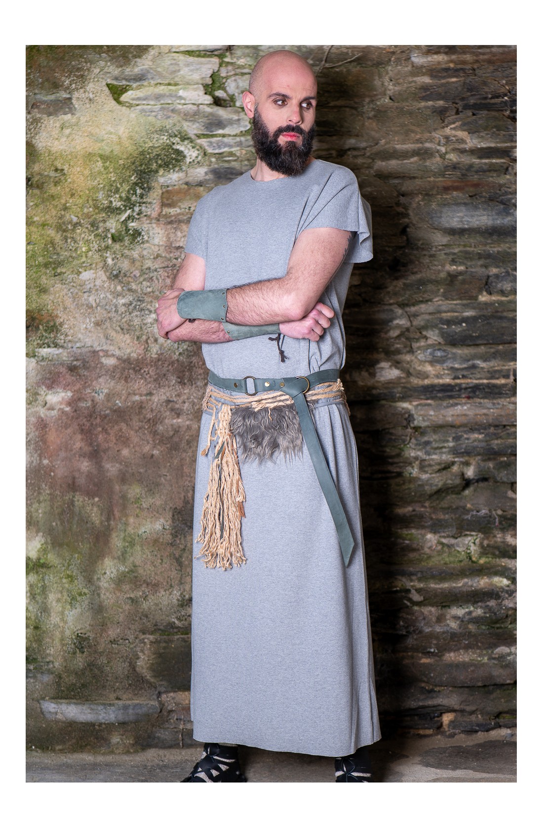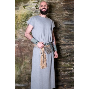 Conjunto celta y vikingo formado por una túnica larga en gris, cómoda, amplia y de talla única, pensada para construir personaje a partir de capas, cuero y accesorios. El set se completa con un cinturón de tejido adornado con cuerda de yute natural, cuerda trenzada y pelo vegano, al que se suma un segundo cinturón de cuero y unos brazales a juego. Un conjunto con aire rústico, diseñado en nuestros talleres, que sirve como punto de partida para dar forma a un personaje de fantasía, celta o vikingo, en ferias, recreación histórica o LARP.