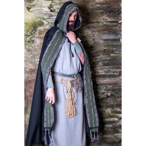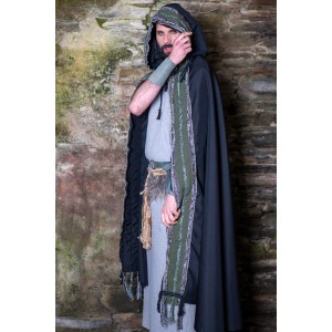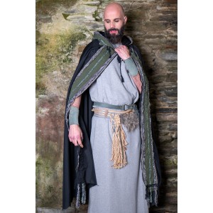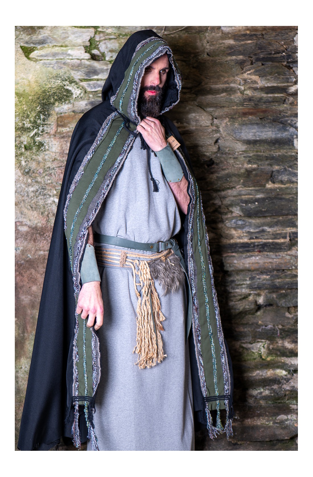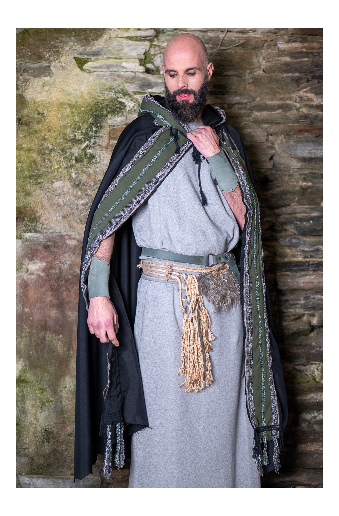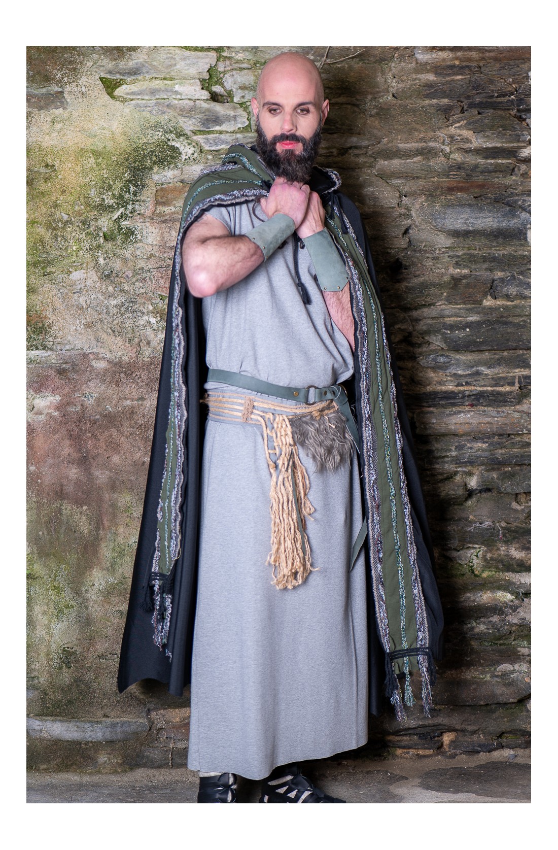 Conjunto celta y vikingo formado por una túnica larga en gris, cómoda, amplia y de talla única, pensada para construir personaje a partir de capas, cuero y accesorios. El set se completa con un cinturón de tejido adornado con cuerda de yute natural, cuerda trenzada y pelo vegano, al que se suma un segundo cinturón de cuero y unos brazales a juego. Un conjunto con aire rústico, diseñado en nuestros talleres, que sirve como punto de partida para dar forma a un personaje de fantasía, celta o vikingo, en ferias, recreación histórica o LARP.