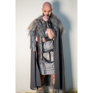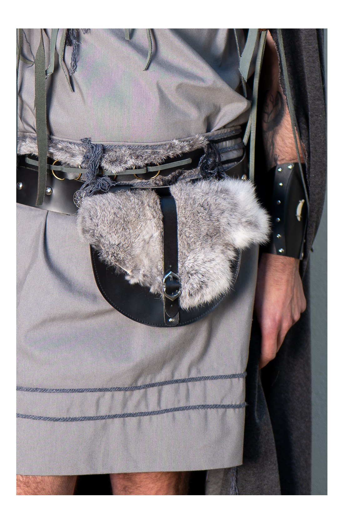 Bolso de cuero negro para enganchar en la trabilla del cinturón, con hebilla plateada y frontal rematado en pelo de conejo natural. Mide 16 cm de alto, 20 cm de ancho y 4 cm de fuelle, y se puede llevar cómodamente en un cinto de hasta 7 cm. El pelo presenta variaciones de tono y dibujo, así que no hay dos piezas iguales. Un diseño de Yutecrea con aire vikingo y celta, pensado para completar personajes de feria medieval, recreación histórica o LARP.