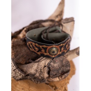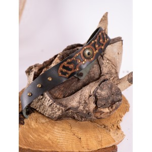 Cinturón en cuero negro y marrón, de ajuste multitalla con cuerdas en la parte trasera, rematado con remaches en dorado envejecido y pieza central a juego. El contraste entre el cuero negro, las aplicaciones en marrón y las piezas metálicas en dorado viejo deja un dibujo rico y más trabajado. Diseñado en los talleres de Yutecrea, está pensado para personajes de fantasía, celtas o vikingos, y suma al vestuario un acabado artesanal que se hace ver en ferias, recreación histórica o LARP.