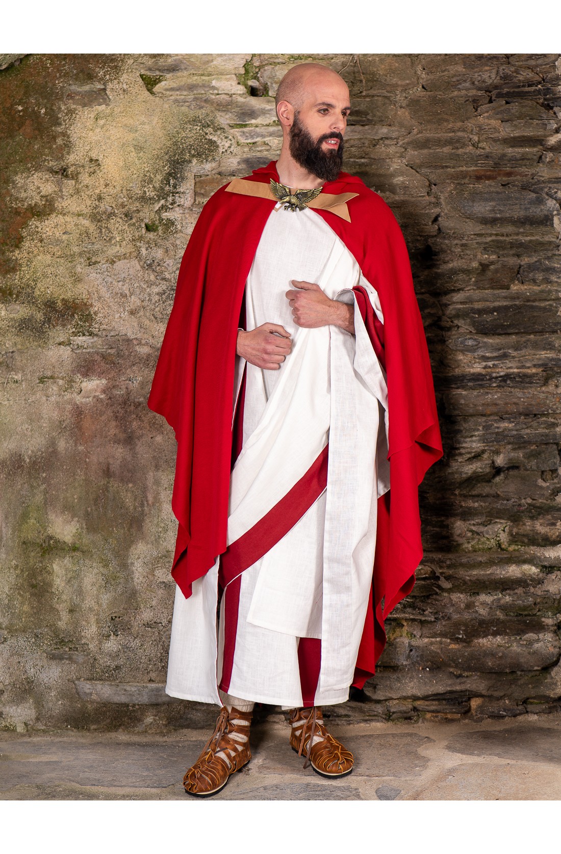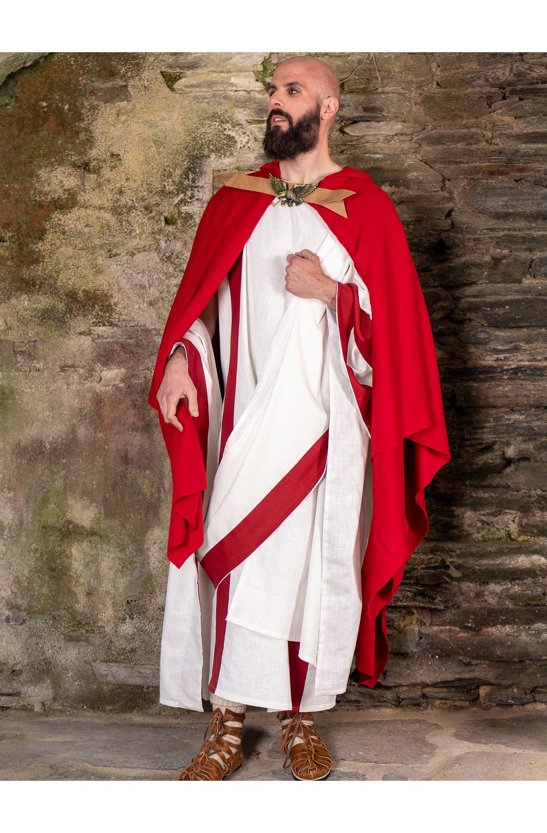 Traje de senador romano confeccionada en mezcla de lino, ideal para recrear una presencia fiel, elegante y con auténtico aire de época. El conjunto incluye túnica con laticlavo y una espectacular toga praetexta de aproximadamente 6 metros, con gran caída, volumen y ese porte inconfundible de la Roma clásica. En tono crudo con franjas rojas, evoca autoridad, distinción y poder. Perfecto para recreación histórica, teatro, eventos temáticos, ferias romanas o vestuario escénico. Una pieza con gran fuerza visual para representar a un senador romano con carácter.