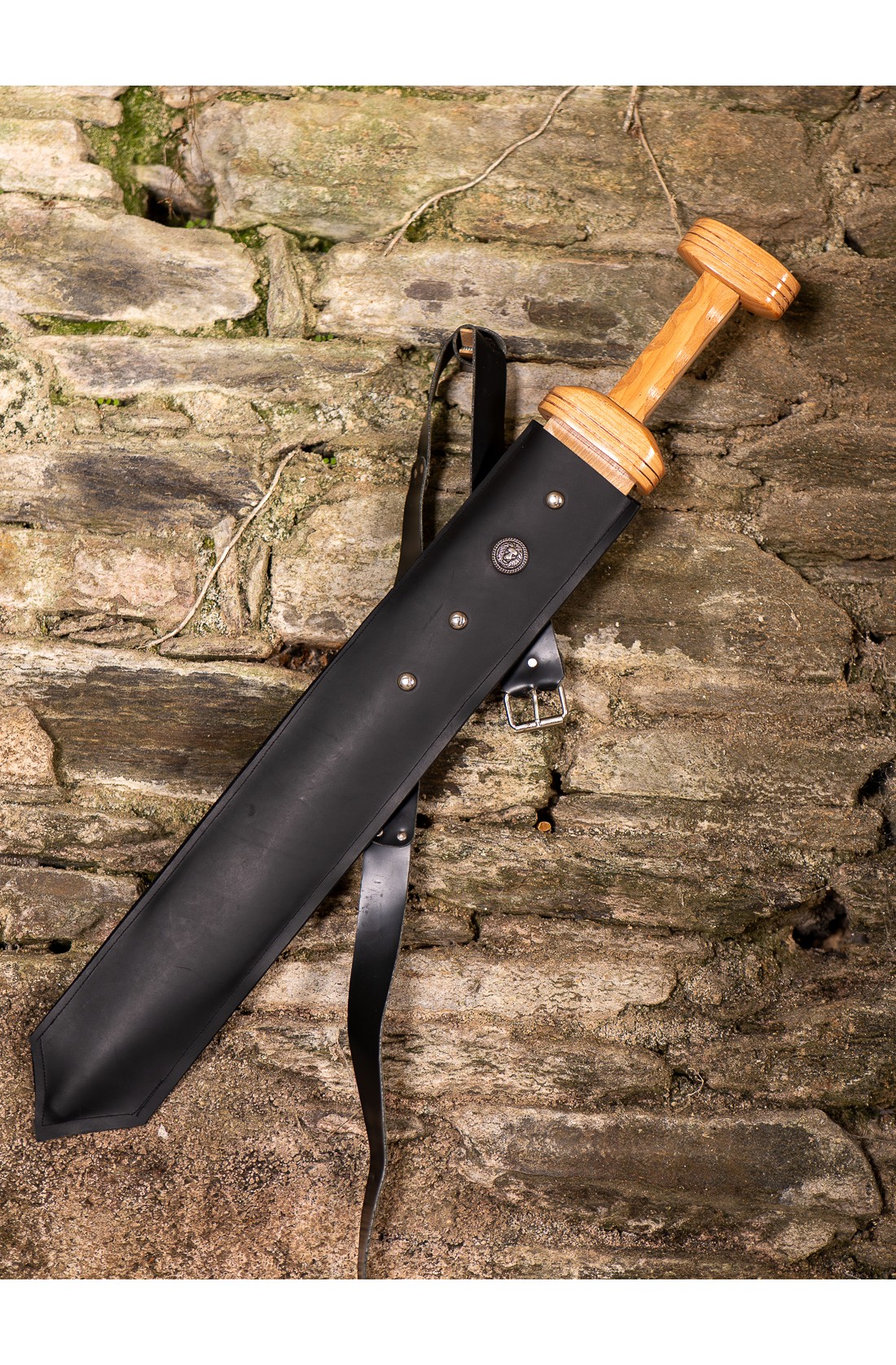 La funda de la espada romana mide 62cm de largo y 7.5cm de ancho y está tintada también de forma manual por nuestro equipo, está adornada por un embellecedor metálico en la parte superior en tono plateado brillante. Tanto el motivo que adorne la funda de la gladius como el color del cuero artesano son elementos que se pueden customizar a tu gusto.