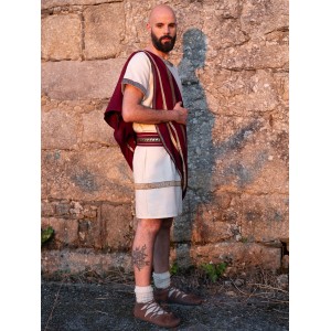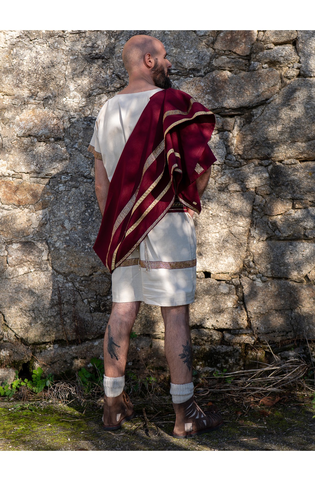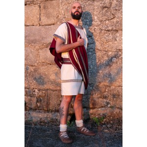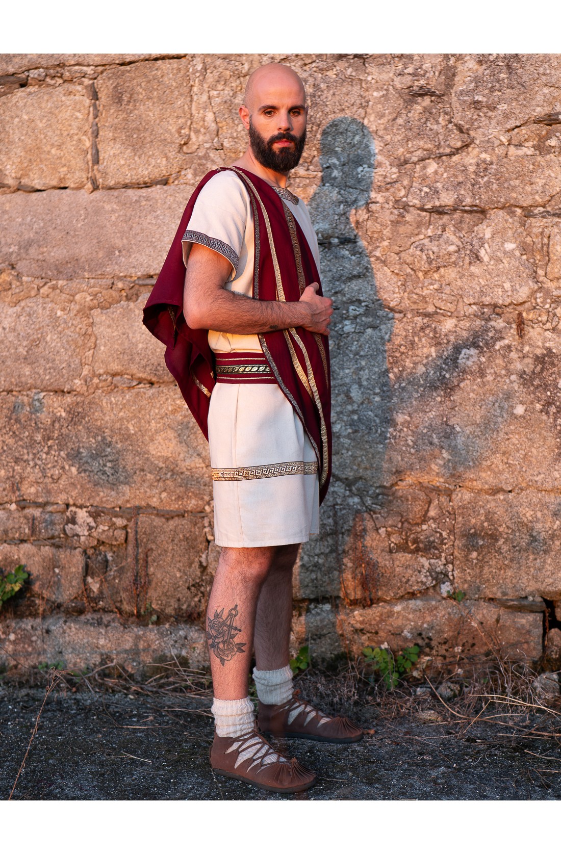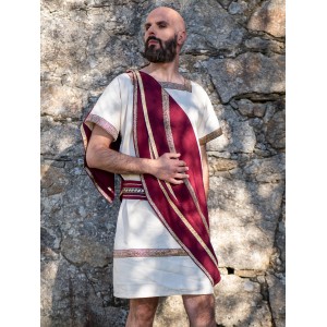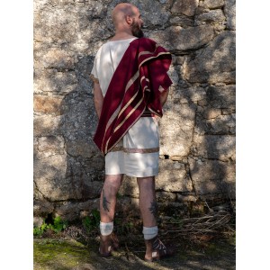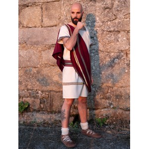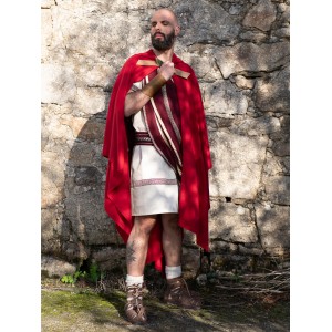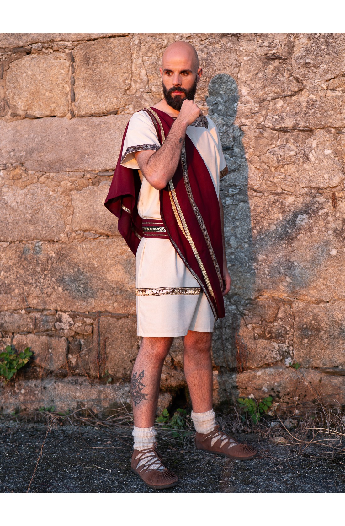 Vestimenta romana de hombre adulto diseñada y confeccionada en Yute en un tejido de algodón para llevar a tus ferias romanas del verano, un traje romano corto de hombre cómodo y fresco con el que destacarás por su elegancia. Tiene un escote cuadrado ribeteado con pasamanería en granate y dorado, los colores míticos del impero romano, con la que a su vez hemos decorado el bajo y las mangas. Este modelo viene con una toga sencilla y de gran caída que atraviesa el traje romano, una pieza de tejido característica, importada de sus vecinos los griegos, que combina a la perfección con el resto de este traje romano artesano de hombre.