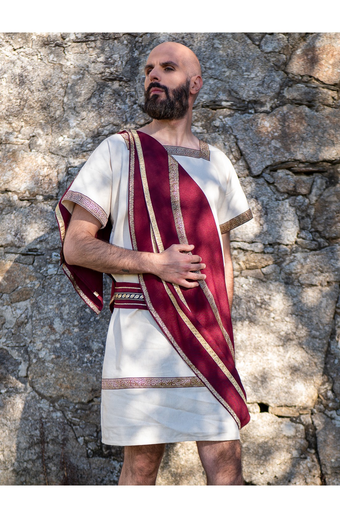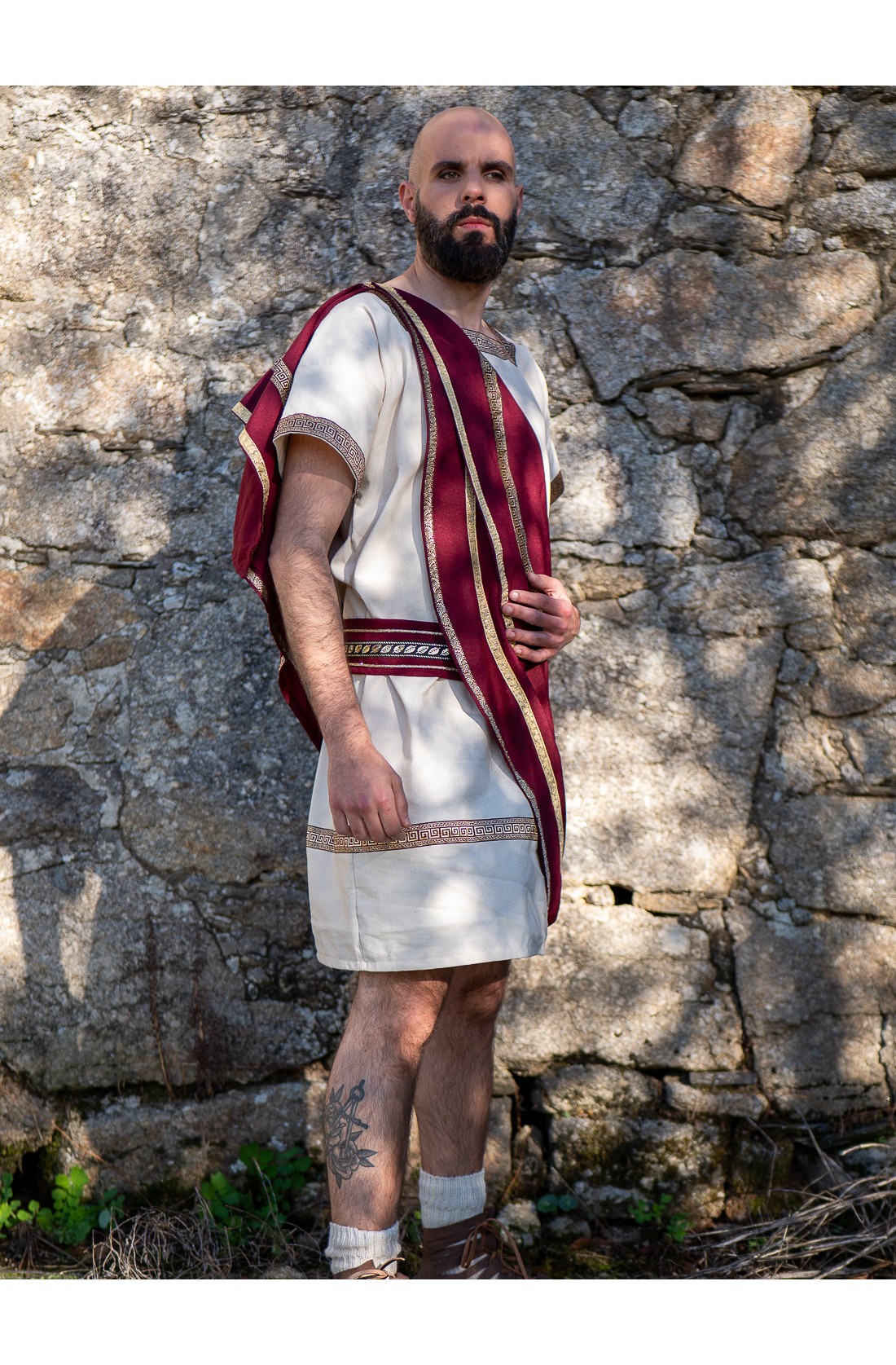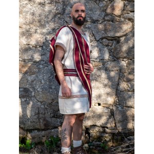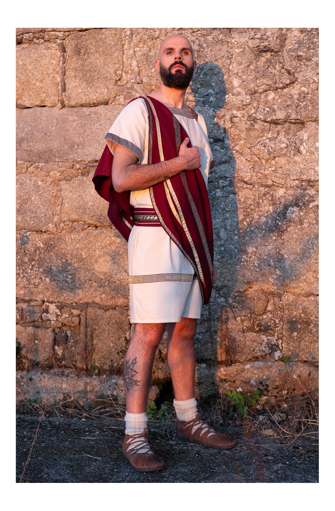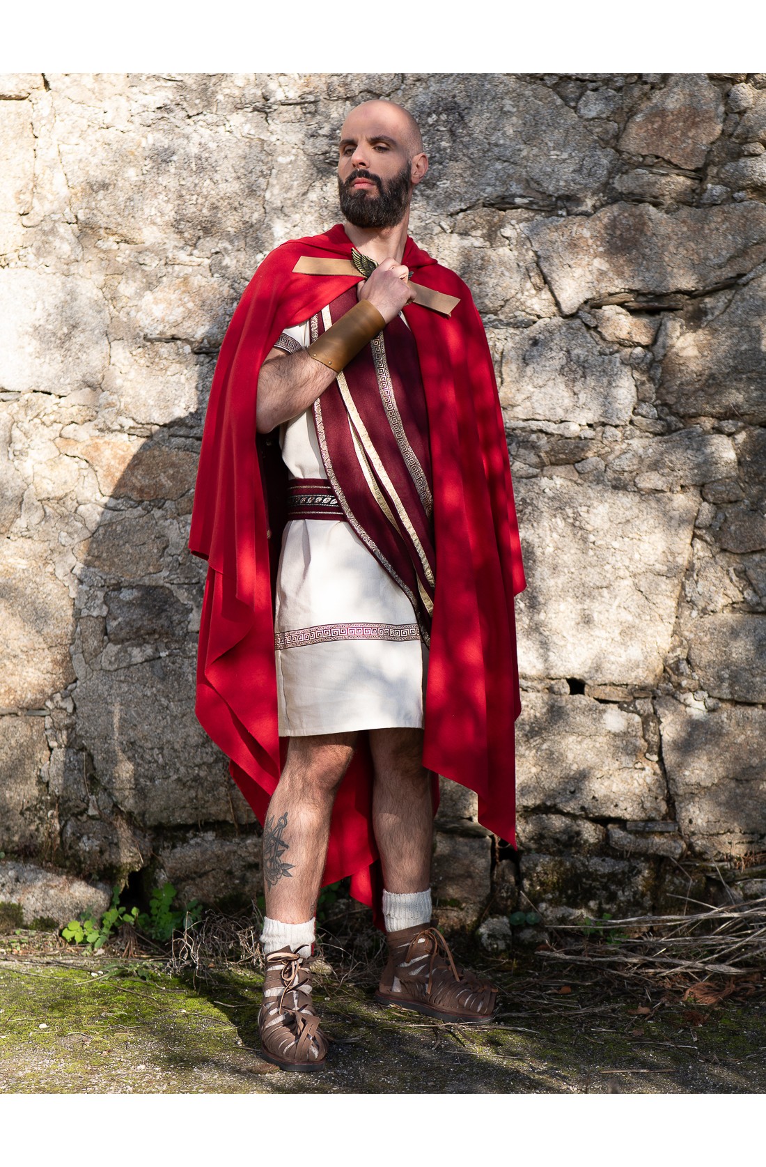 Vestimenta romana de hombre adulto diseñada y confeccionada en Yute en un tejido de algodón para llevar a tus ferias romanas del verano, un traje romano corto de hombre cómodo y fresco con el que destacarás por su elegancia. Tiene un escote cuadrado ribeteado con pasamanería en granate y dorado, los colores míticos del impero romano, con la que a su vez hemos decorado el bajo y las mangas. Este modelo viene con una toga sencilla y de gran caída que atraviesa el traje romano, una pieza de tejido característica, importada de sus vecinos los griegos, que combina a la perfección con el resto de este traje romano artesano de hombre.