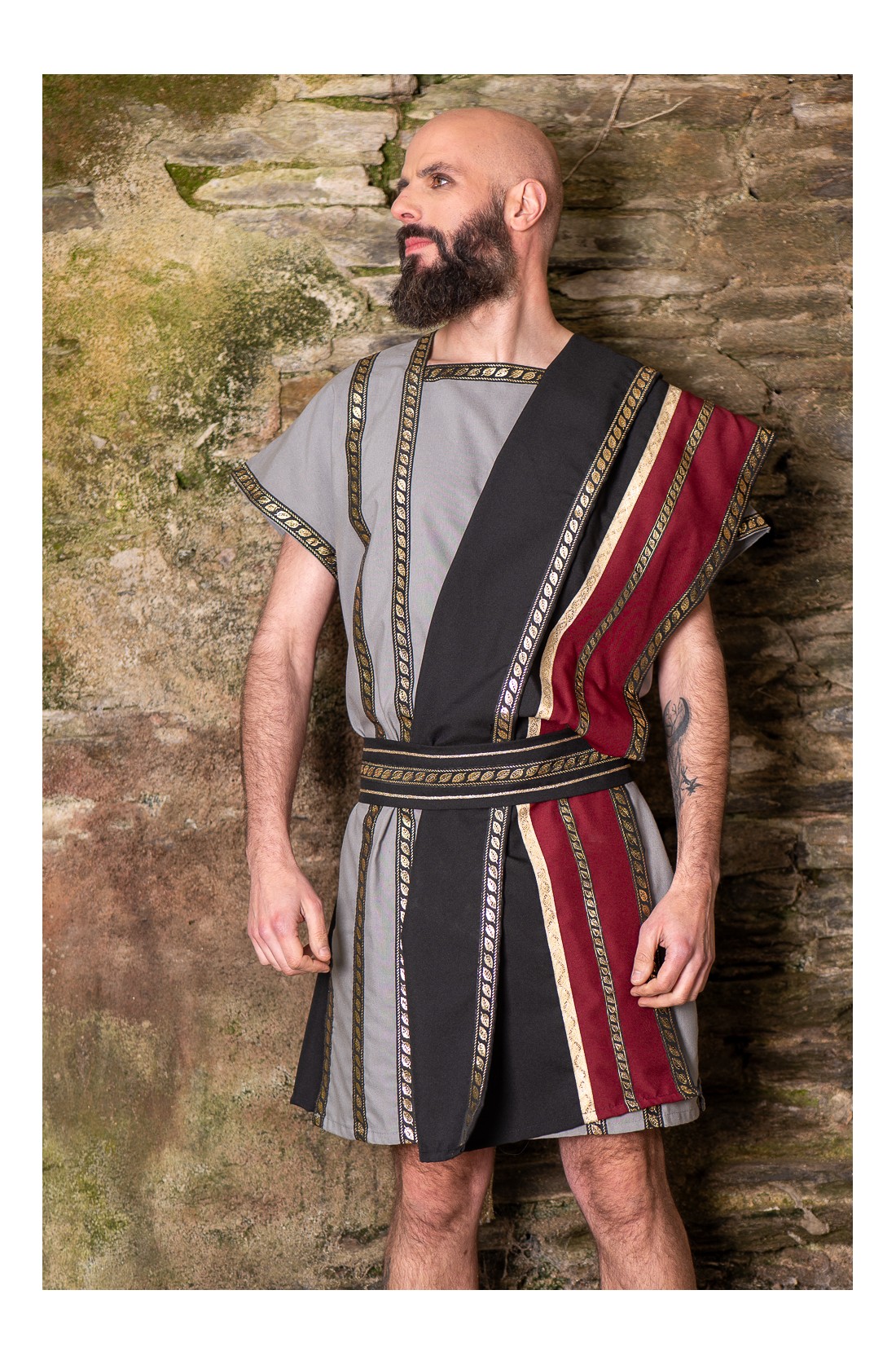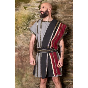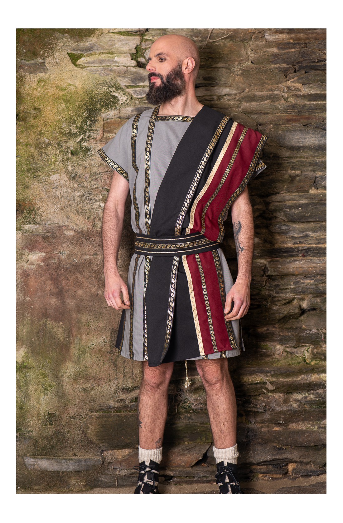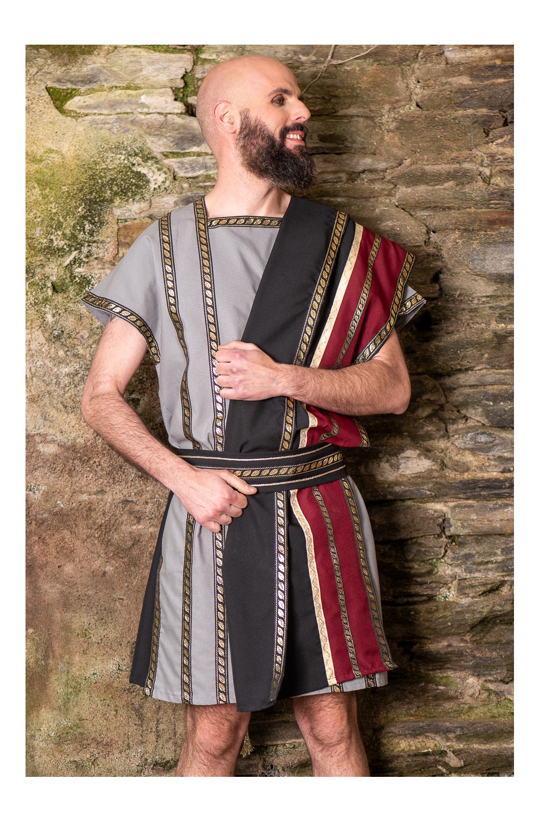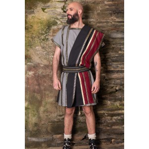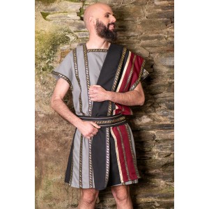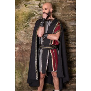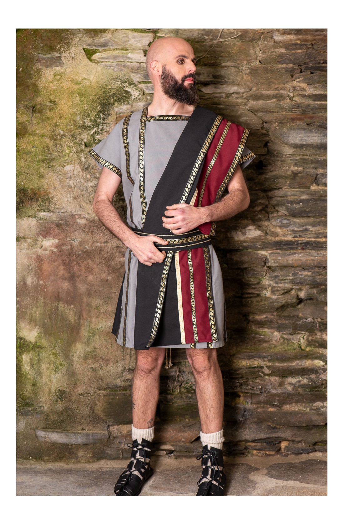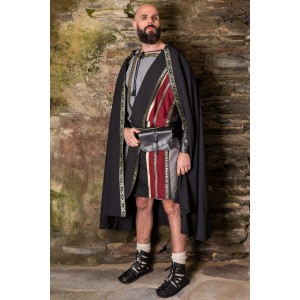 Traje romano gris con toga negra y granate y cinturón.