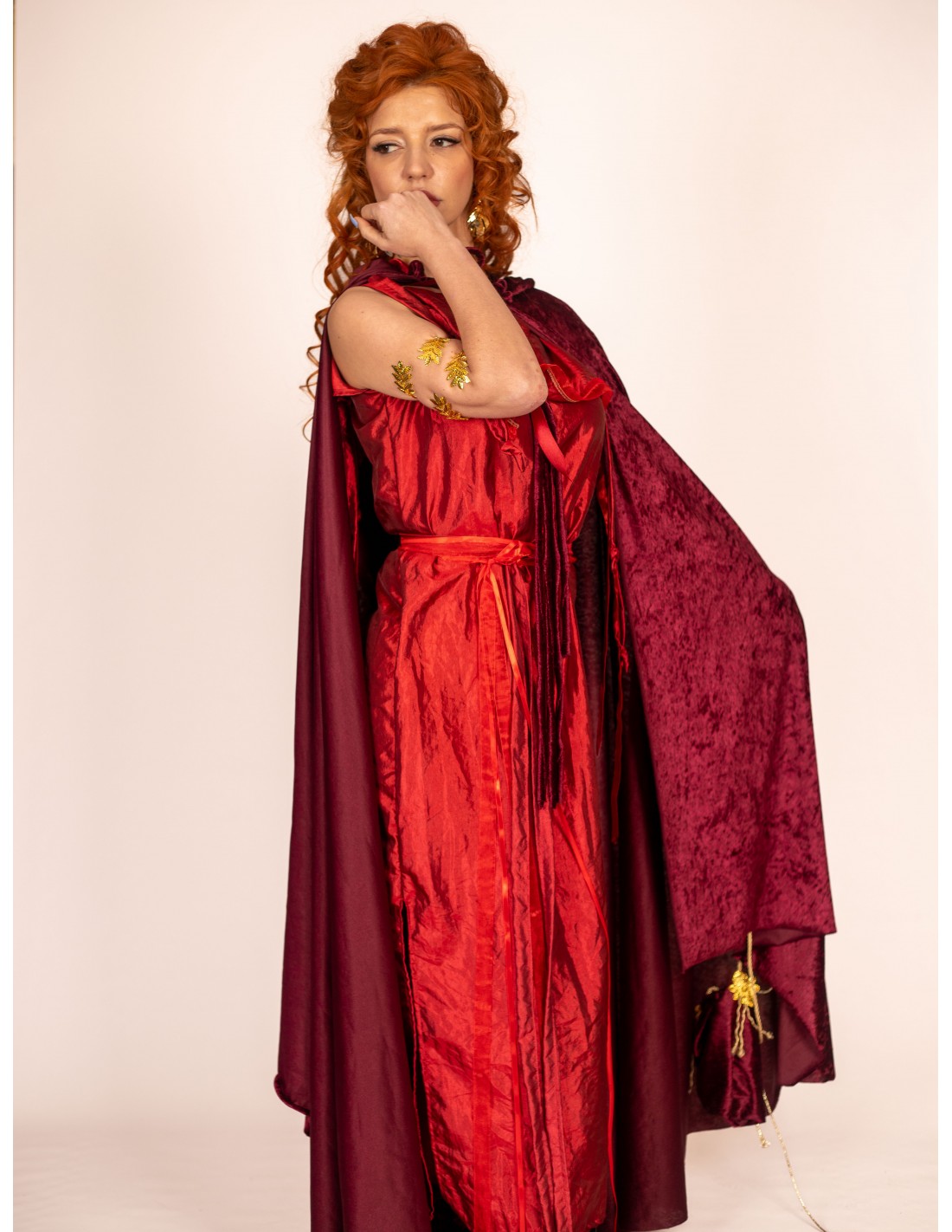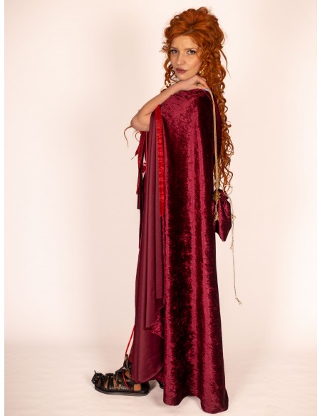 Elaborado con maestría artesanal, cada bolso refleja un profundo respeto por las tradiciones de la Roma antigua, mientras abraza la funcionalidad necesaria en la vida moderna. La fusión de texturas y el contraste de los adornos dorados sobre el rico color del terciopelo crean una pieza que no solo complementa, sino que eleva cualquier atuendo de temática romana.