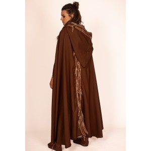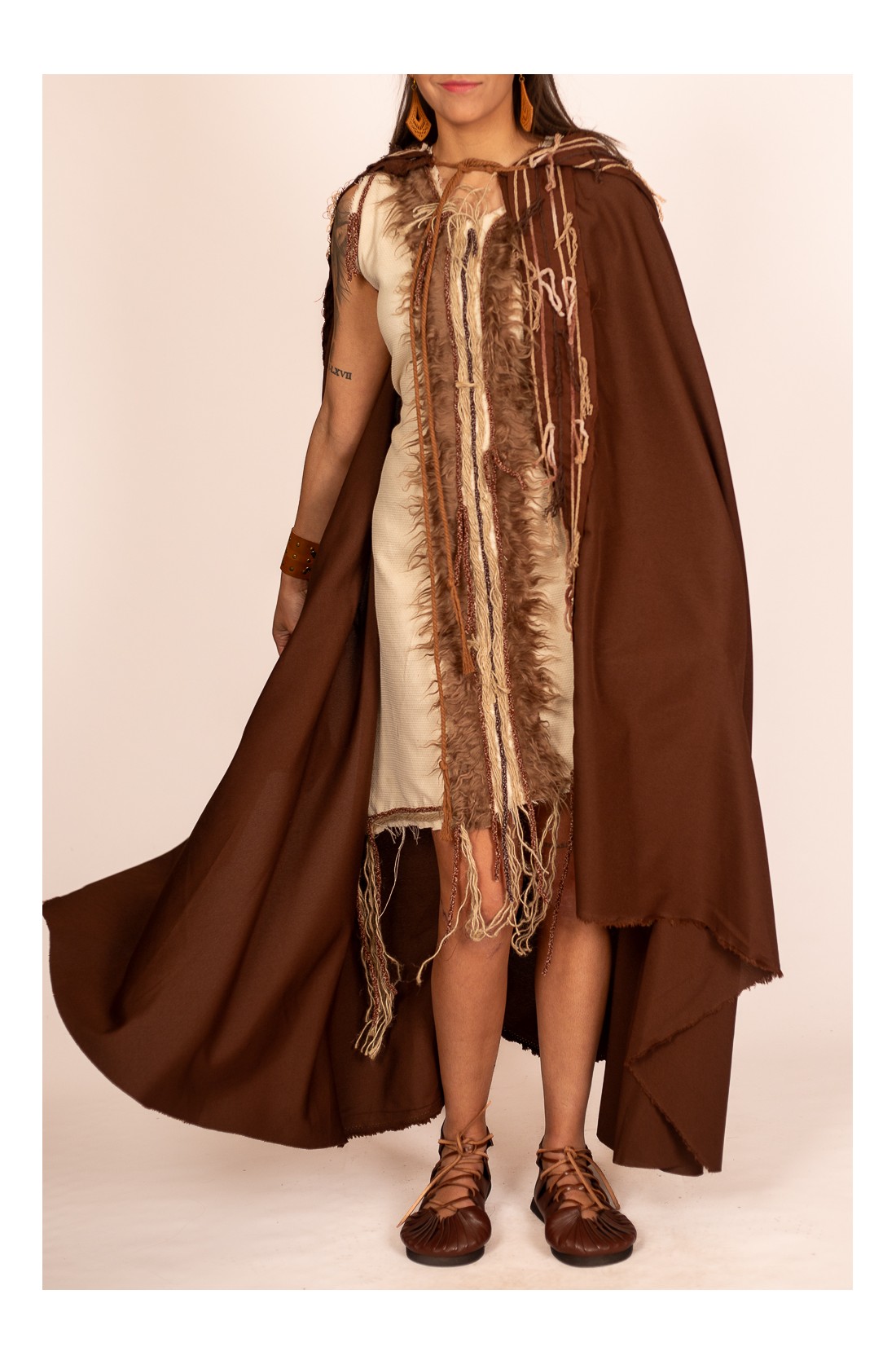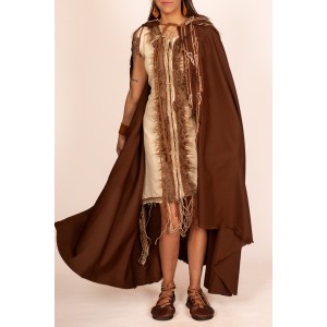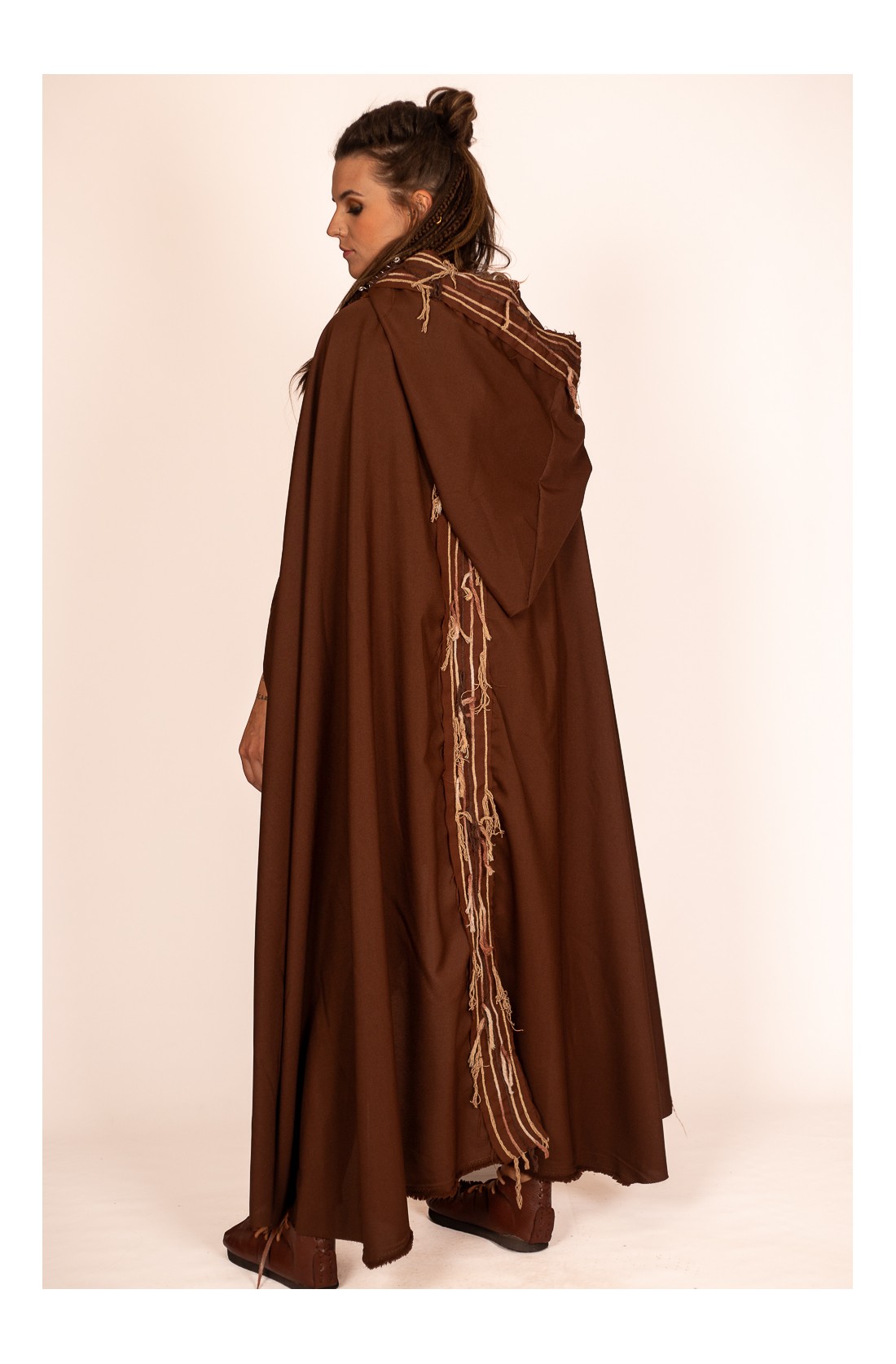 Accesorio celta o vikingo de Yutecrea para destacar en ferias históricas y eventos de recreación o fantasía. Esta capa marrón con capucha, ribeteada con lanas y cuerdas, tiene una apariencia rústica. Perfecta para ferias celtas o vikingas.